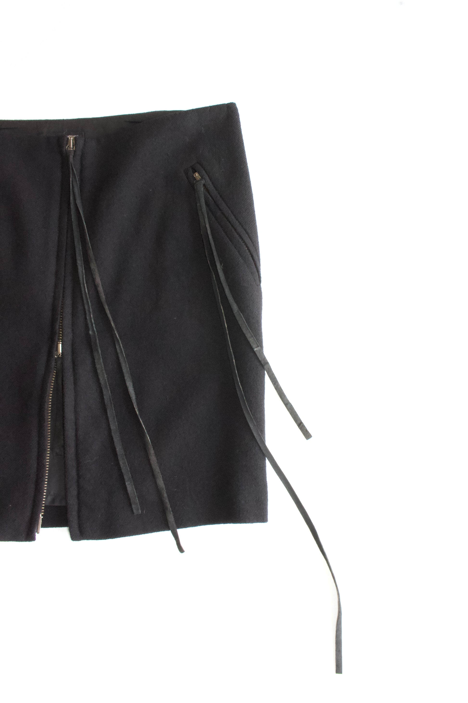 Black crepe wool with suede strings. Zipper down the middle that can be unzipped from the top or bottom. Full lining.