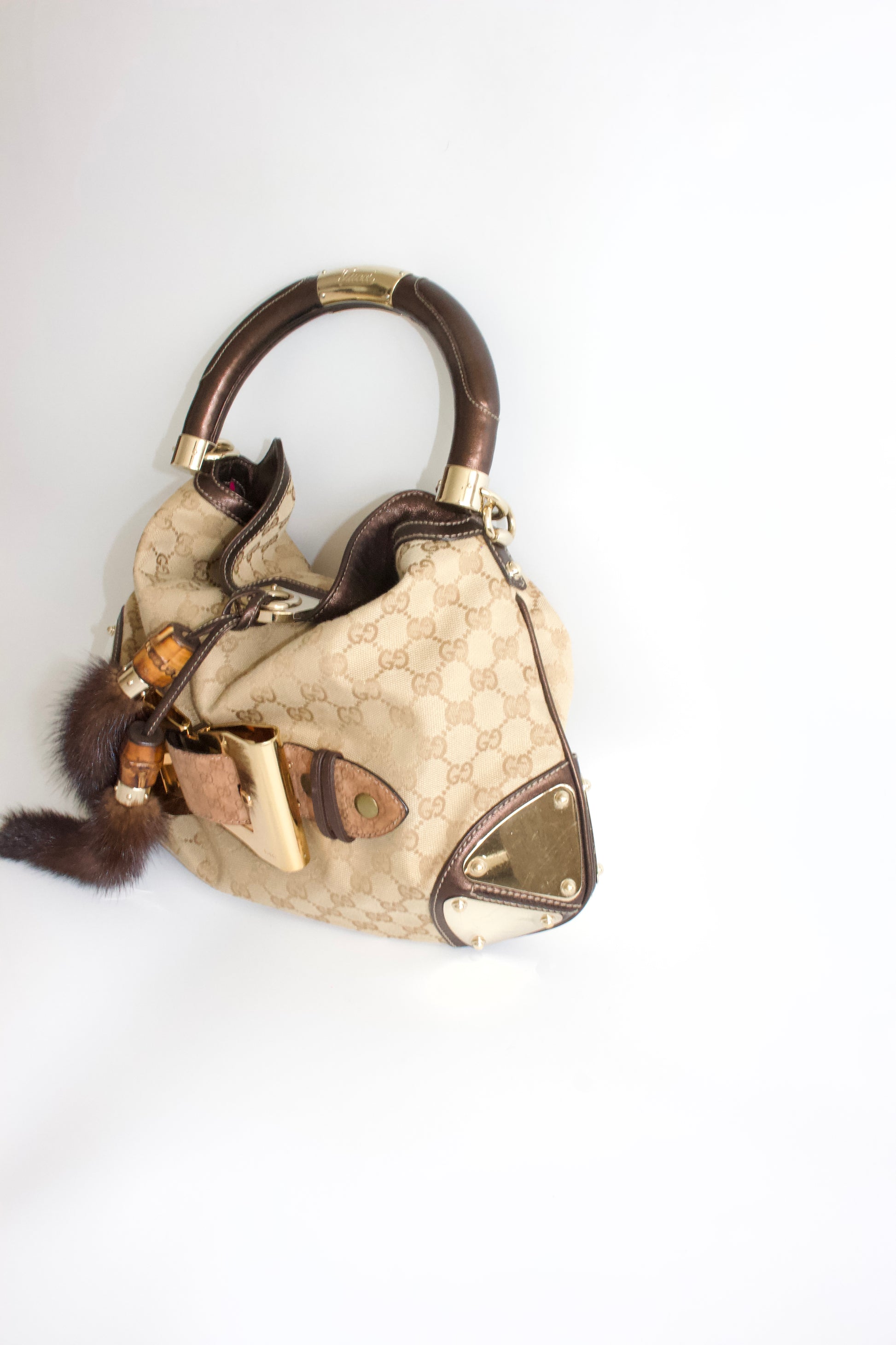 Gucci Indy brown monogram bag with mink fur tassels
