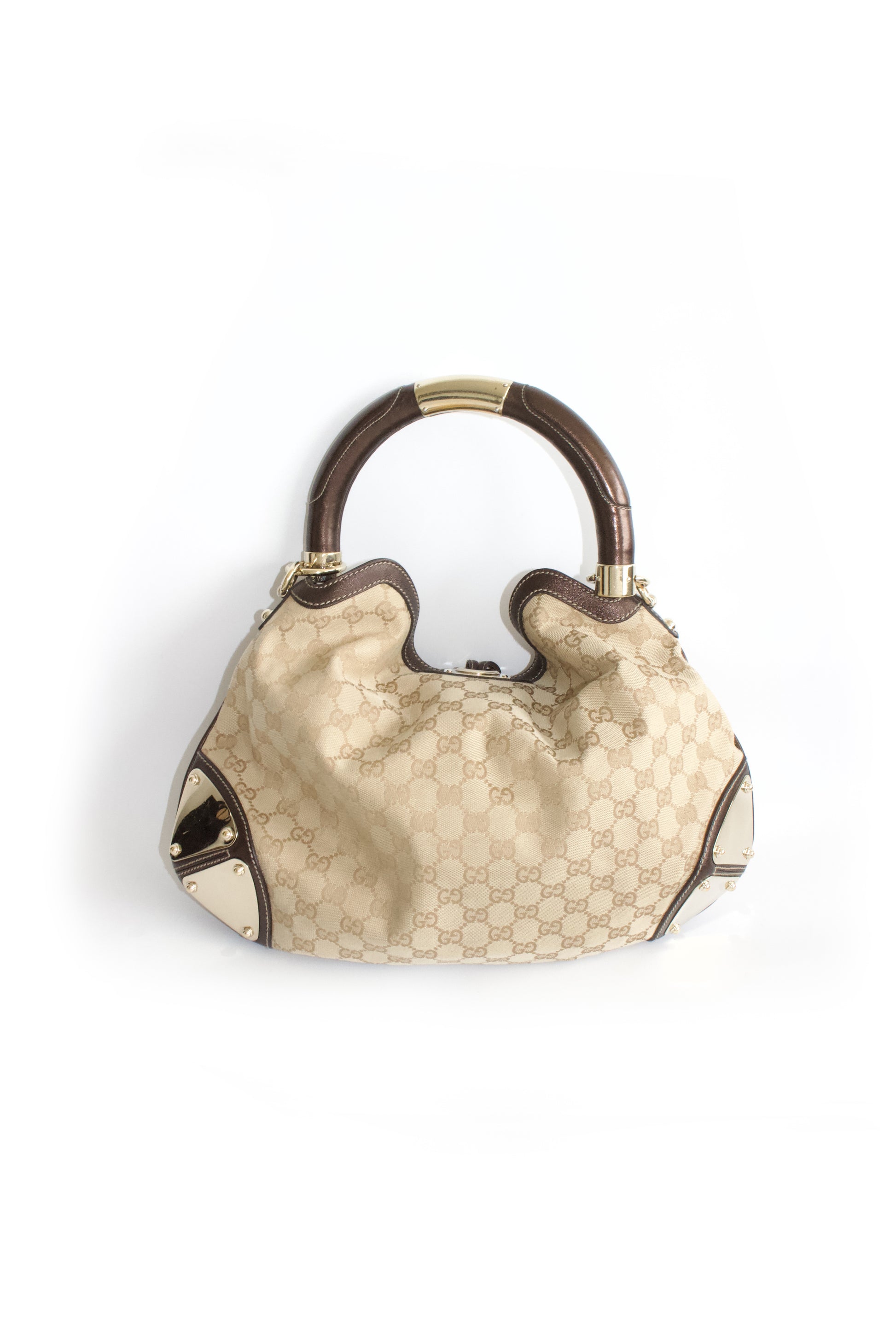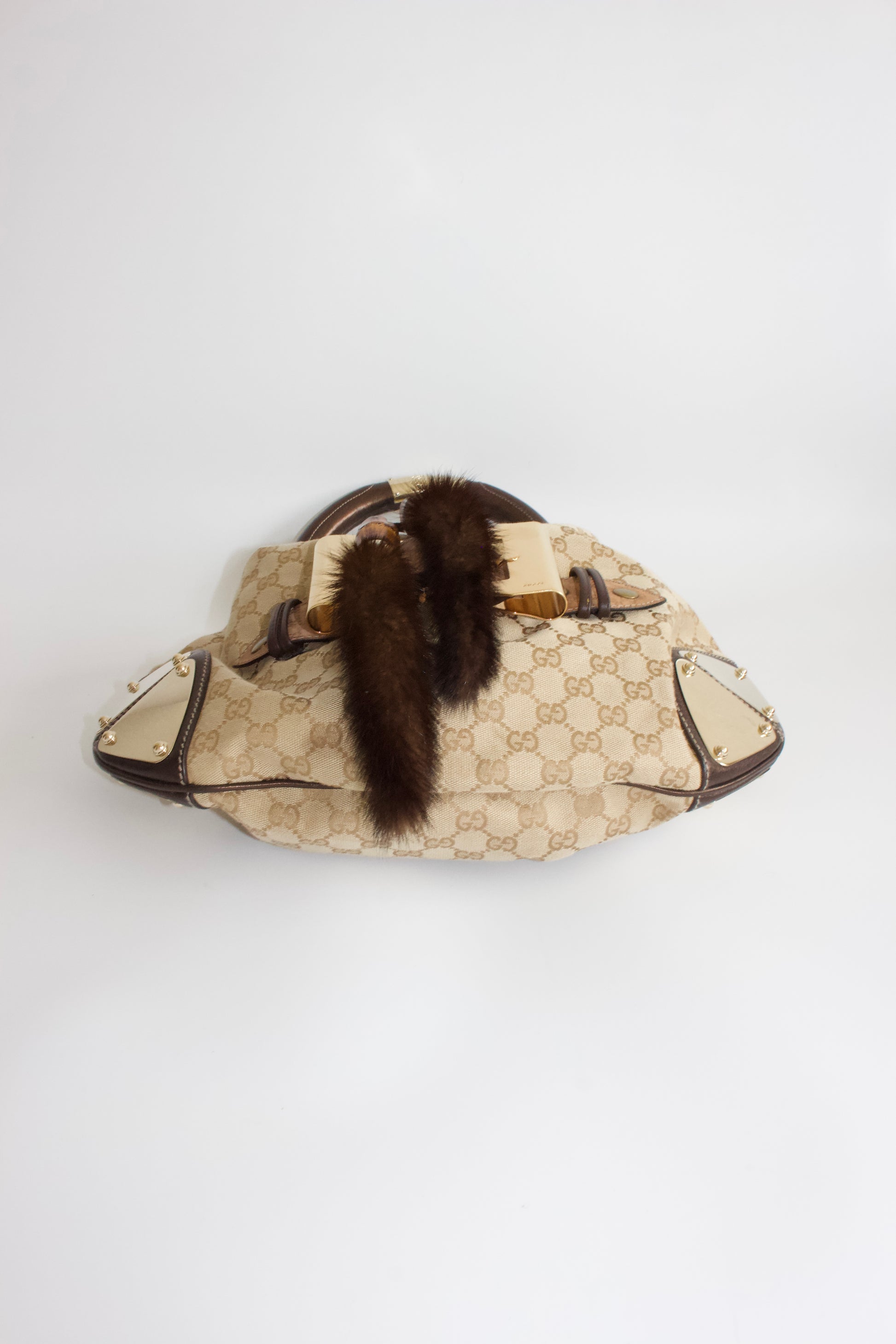 Iconic GG monogram adorned with golden hardware and mink fur tassels.