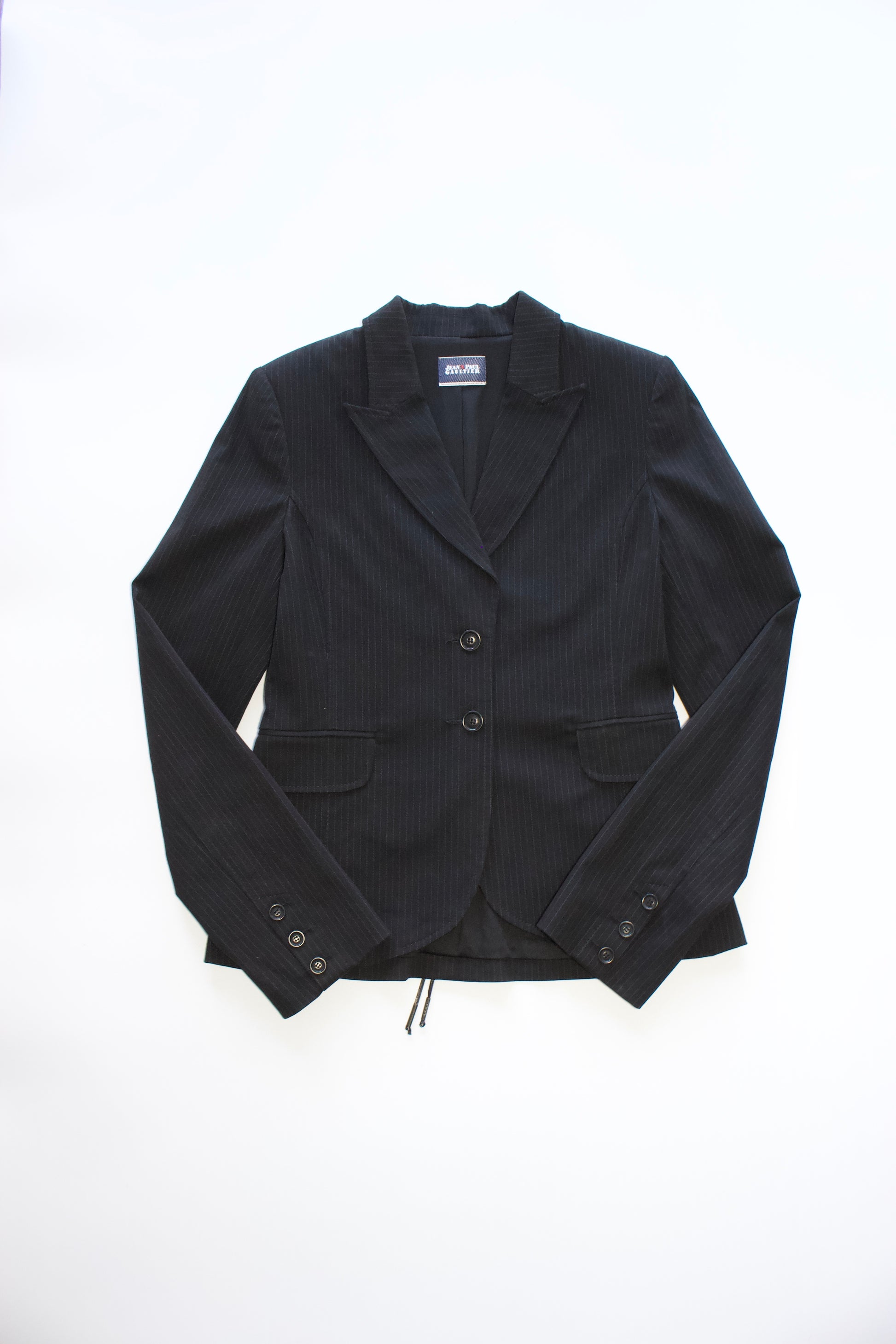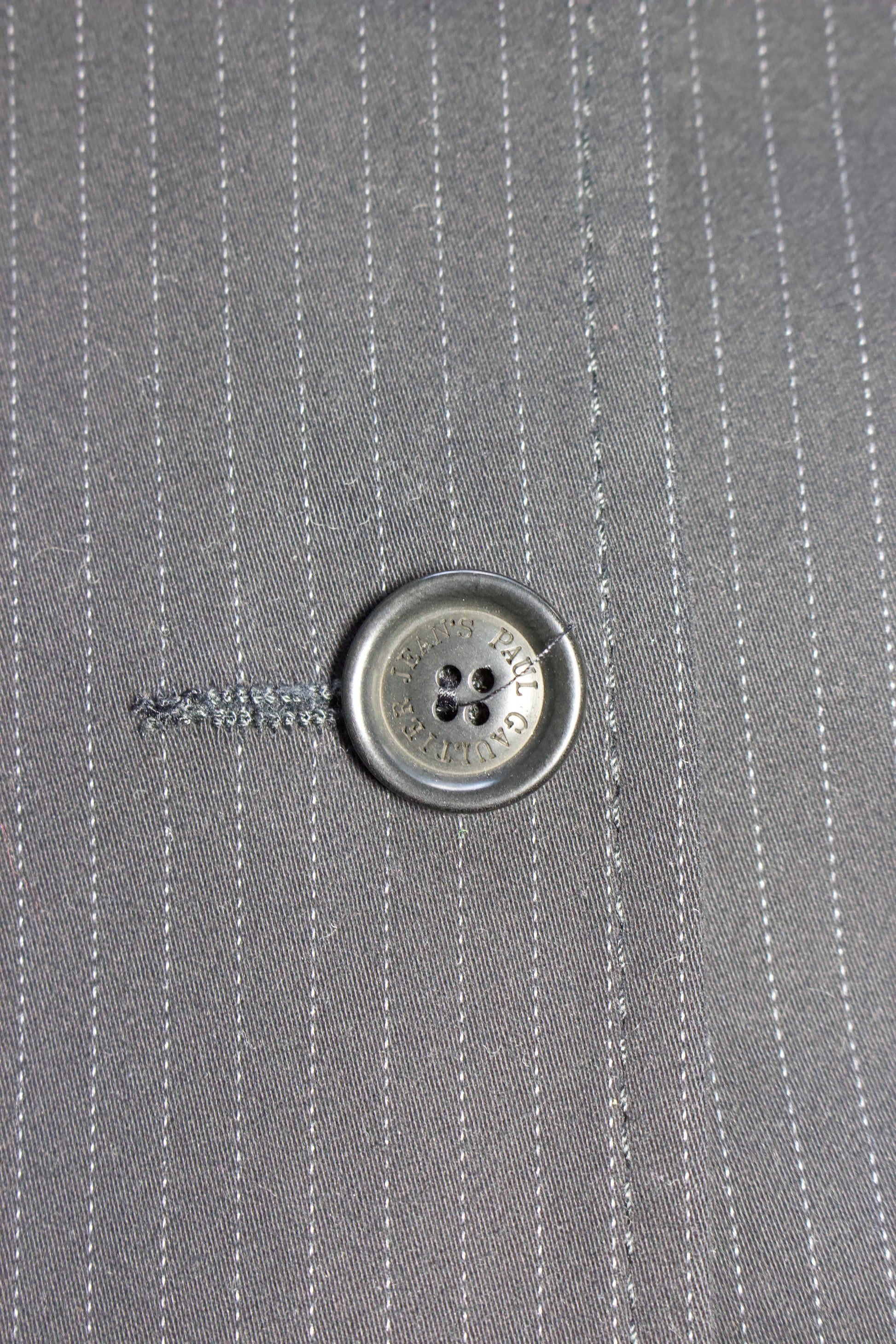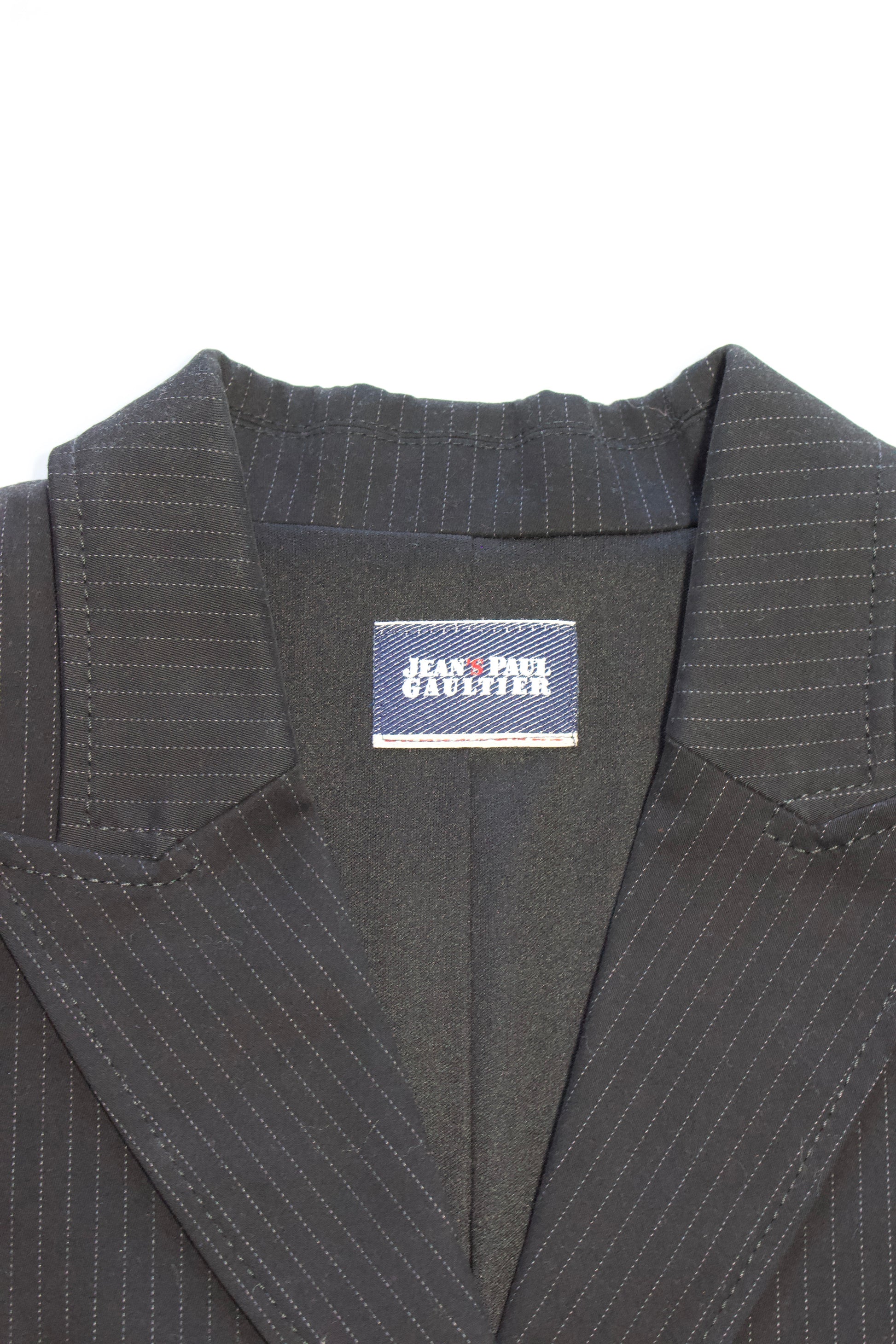 Jean Paul Gaultier black pinstripe blazer with back corset, Jean Paul Gaultier corset-back blazer, Jean Paul Gaultier pinstripe jacket, Jean Paul Gaultier tailored blazer, Jean Paul Gaultier archival fashion, Jean Paul Gaultier structured jacket, Jean Paul Gaultier vintage blazer, Jean Paul Gaultier statement outerwear, Jean Paul Gaultier designer blazer, Jean Paul Gaultier collectible fashion piece.