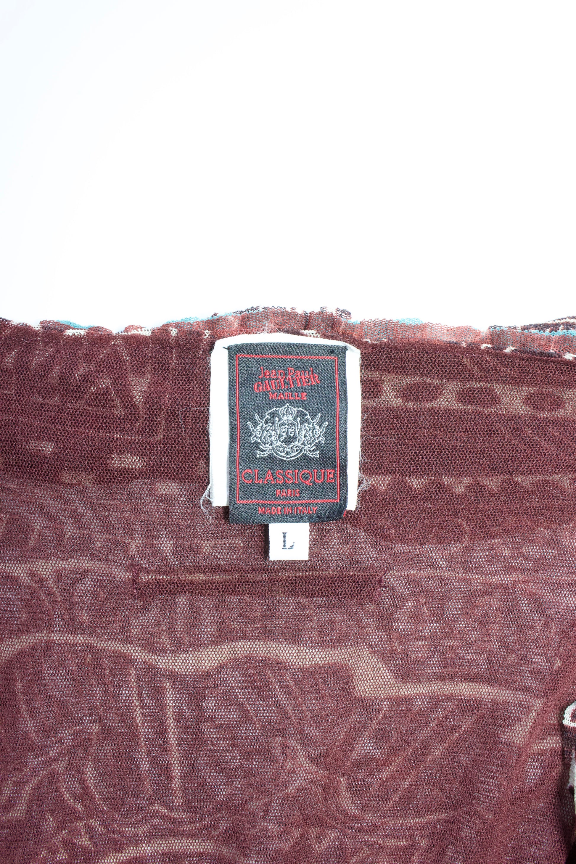 Jean Paul Gaultier brick-red and blue robe with ruffles, Jean Paul Gaultier designer robe, Jean Paul Gaultier statement piece, Jean Paul Gaultier luxury fashion, Jean Paul Gaultier archival clothing, Jean Paul Gaultier runway robe, Jean Paul Gaultier ruffled robe, Jean Paul Gaultier vintage-inspired fashion, Jean Paul Gaultier elegant long robe, Jean Paul Gaultier collectible fashion piece.