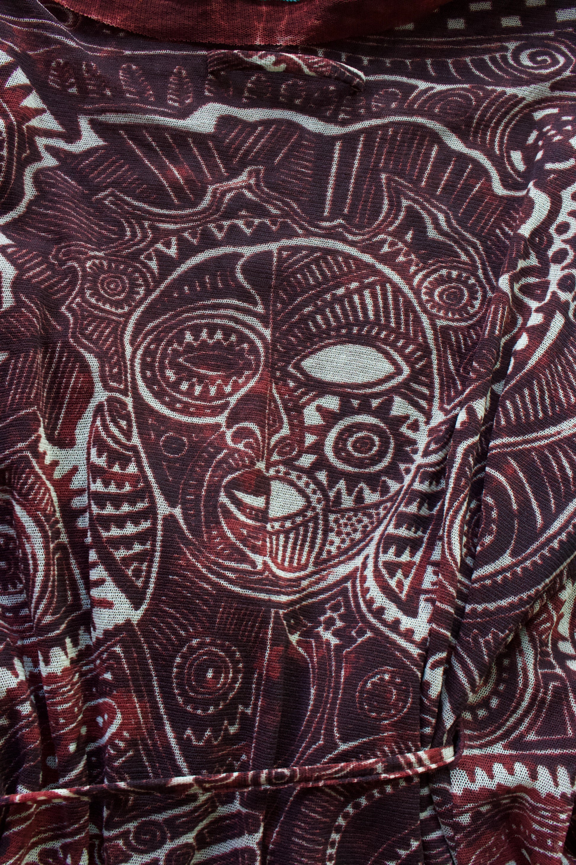 This wrap-around robe could be worn as a top or a dress, tightened together by a pair of strings. The brick-red pattern is complemented by bright teal ruffles that wrap around the neck, down both of the sides and around the skirt.