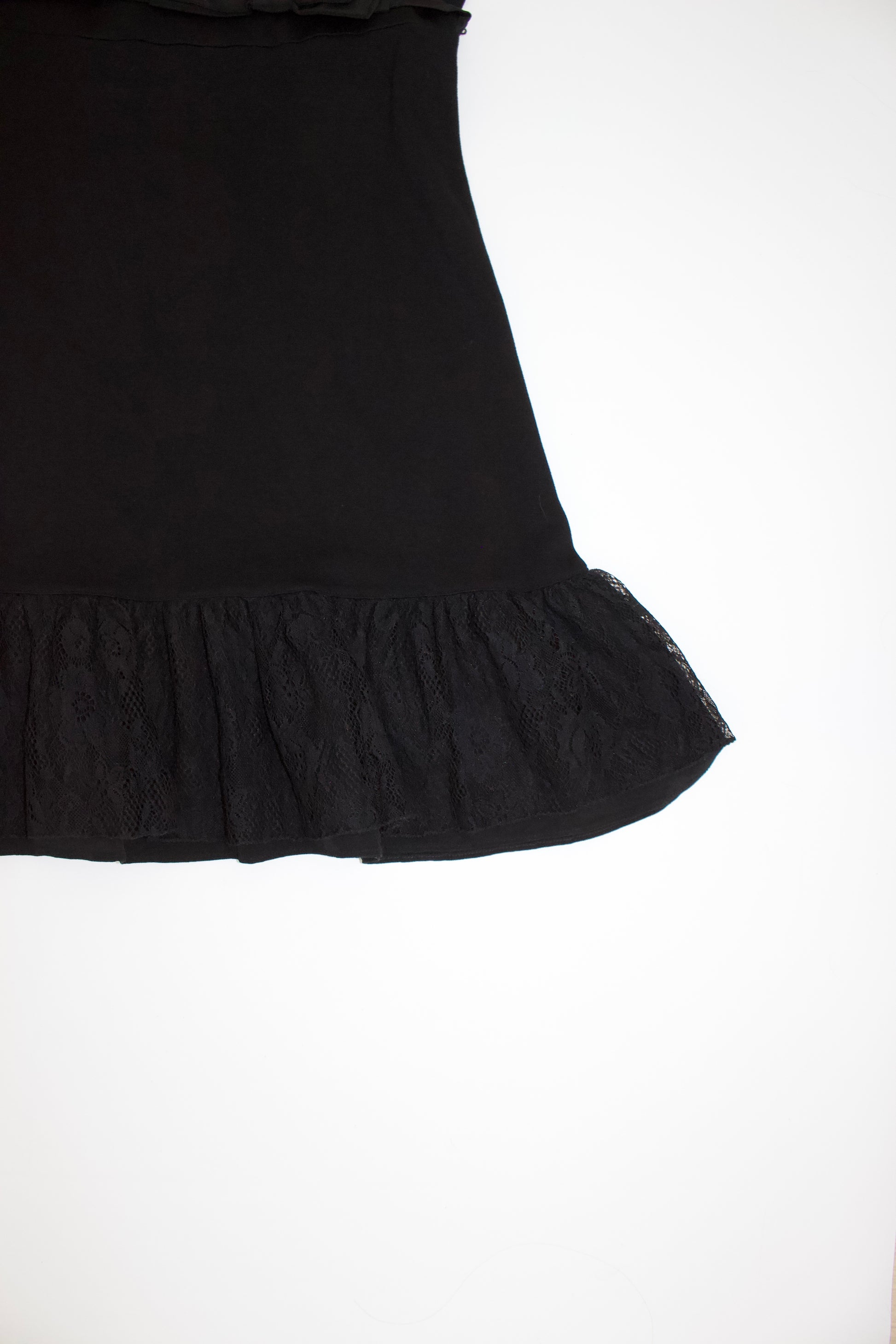 The playful, feminine style of Miu Miu is reflected in this dress, with its lace back panelling and a bow tie belt at the waist. The little black dress is sleeveless, with the skirt falling just above the knee in opulent lace ruffles.