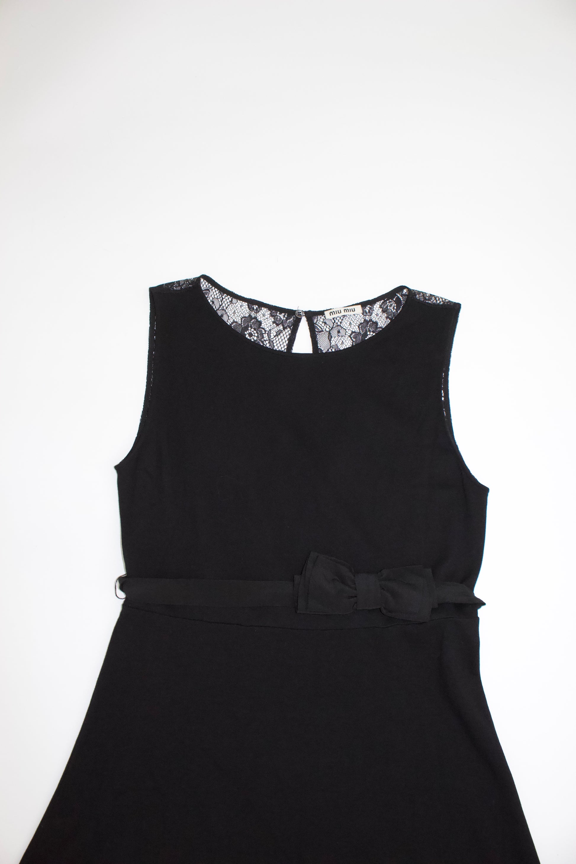 Miu Miu black dress with bow tie, Miu Miu lace back dress, Miu Miu elegant black dress, Miu Miu bow tie dress, Miu Miu lace detail dress, designer Miu Miu black dress, Miu Miu evening dress, Miu Miu statement dress, Miu Miu black lace dress, Miu Miu luxury dress.