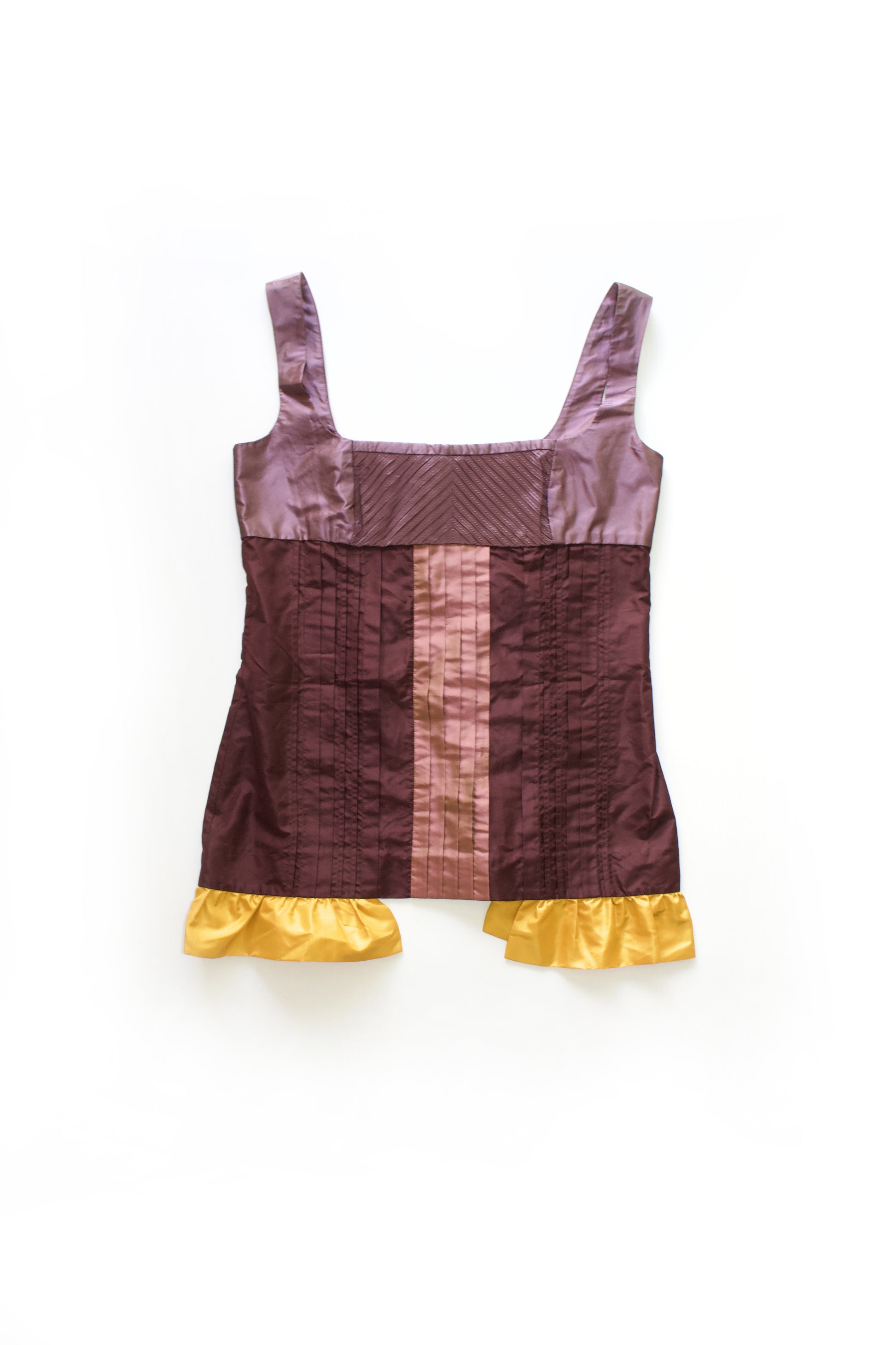 Corset-type purple top with yellow peplum.