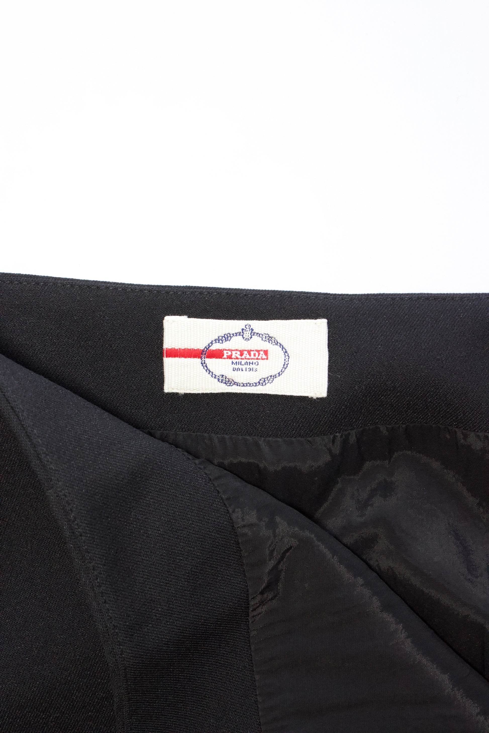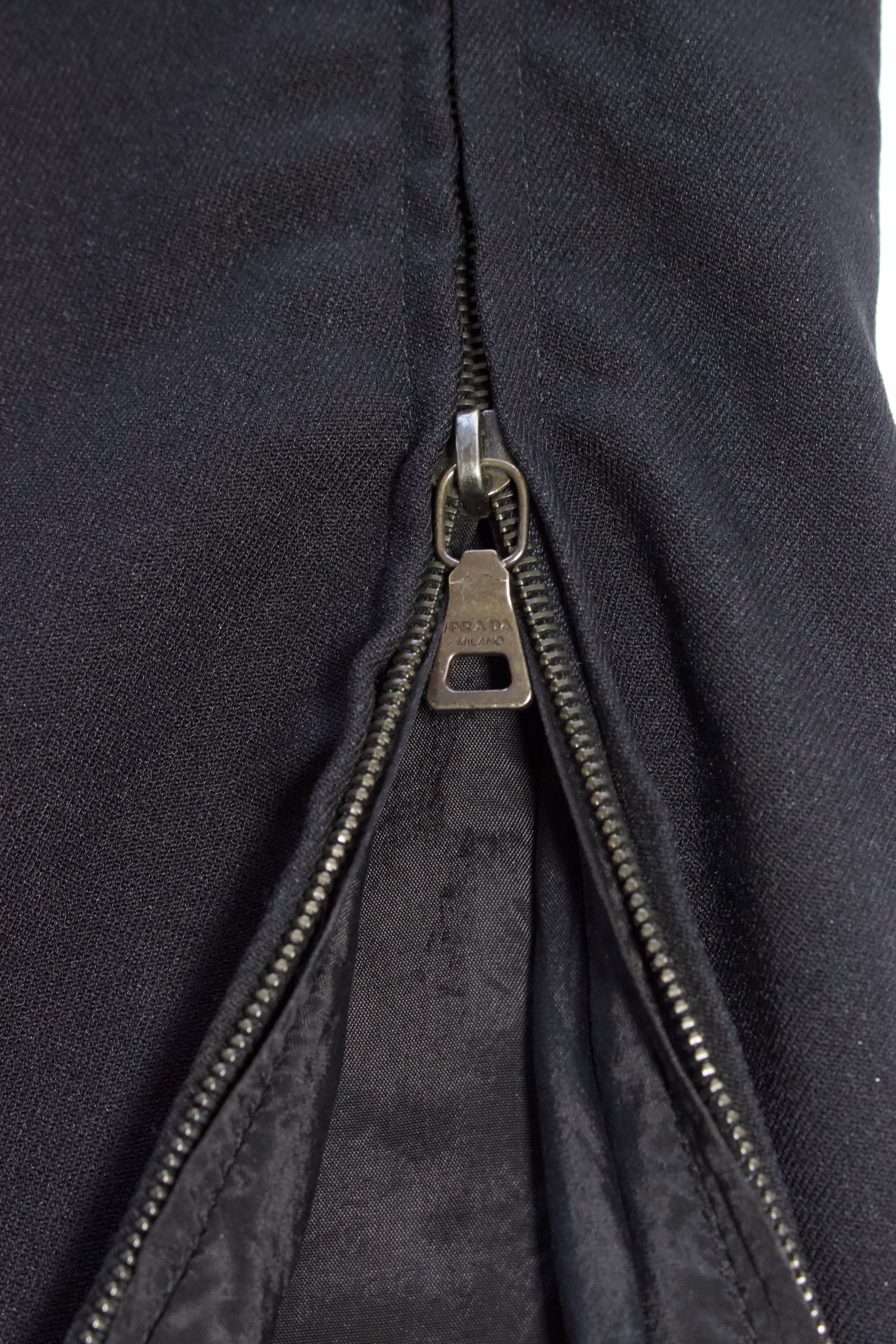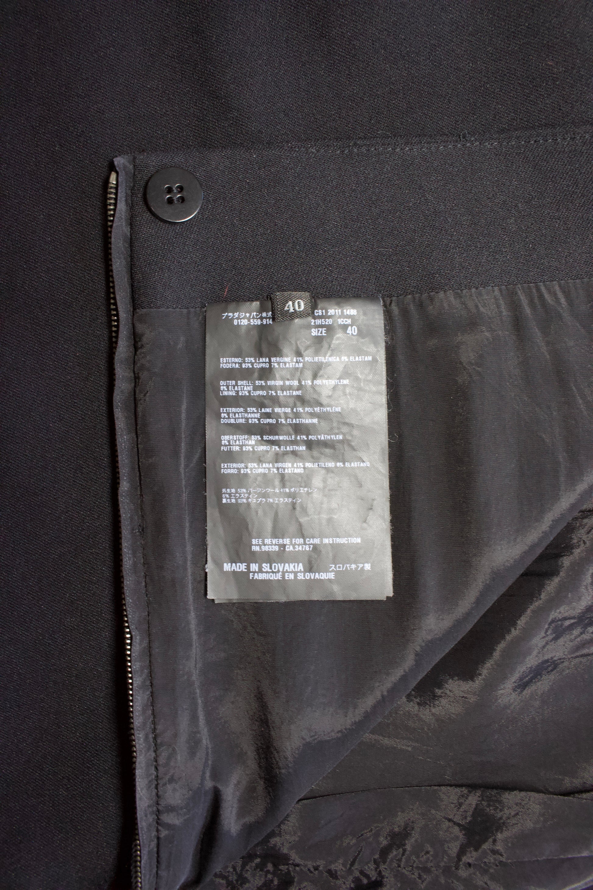 Black fine wool with lining. Features a zip running down the left side that can be fully zipped-up or unzipped to create a slit.