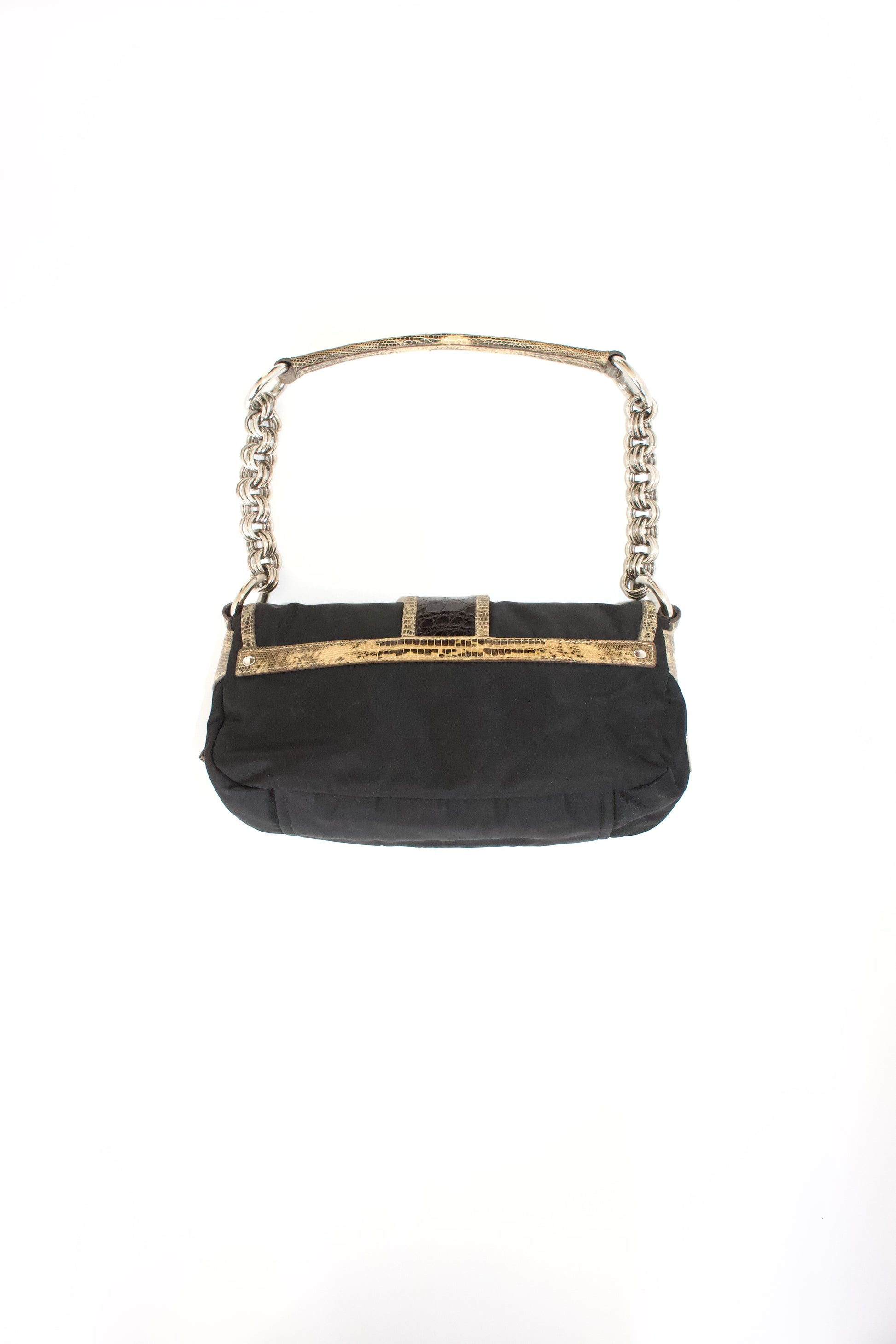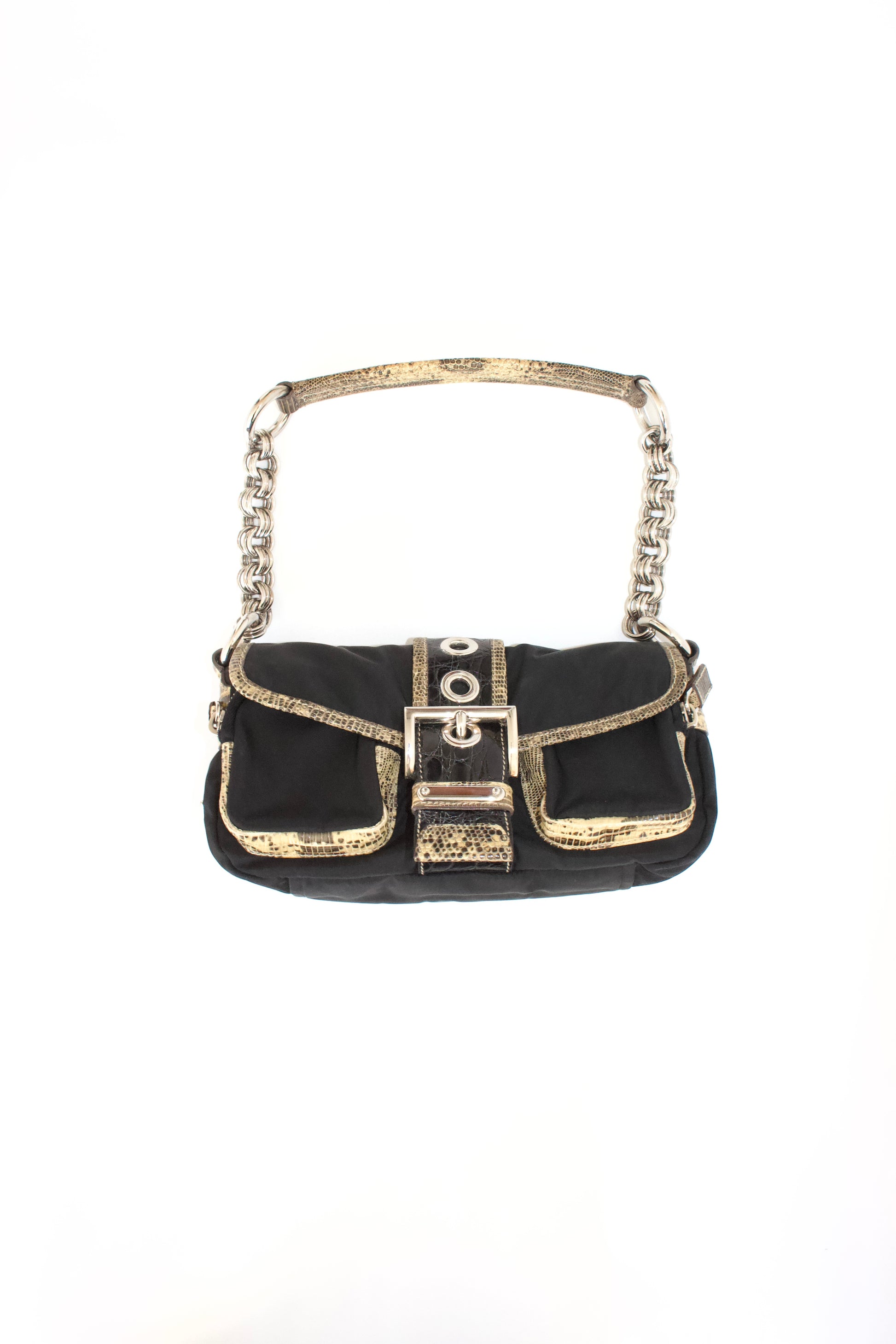 Black nylon with brown python skin piping and handles. Silver-toned hardware.