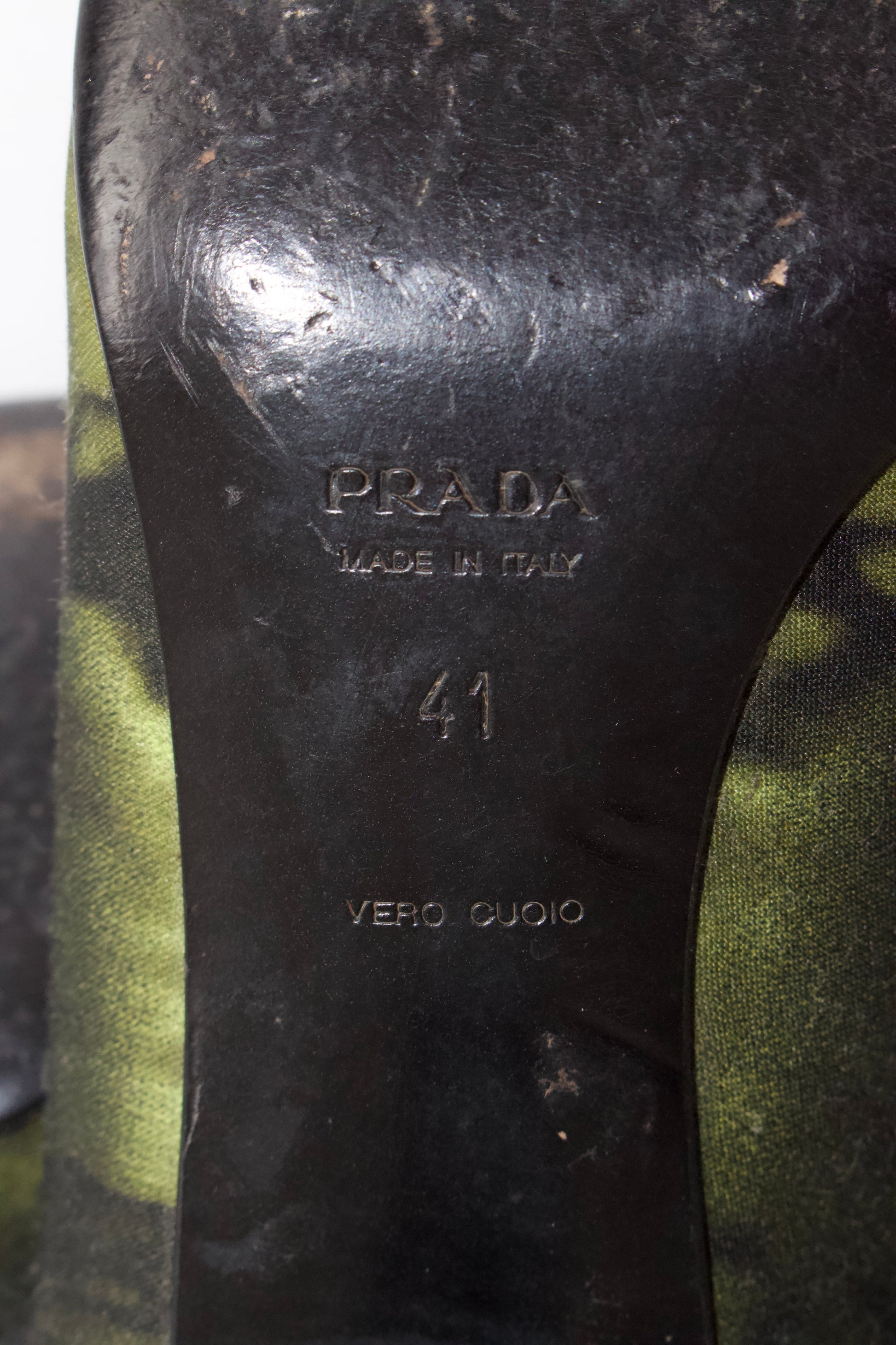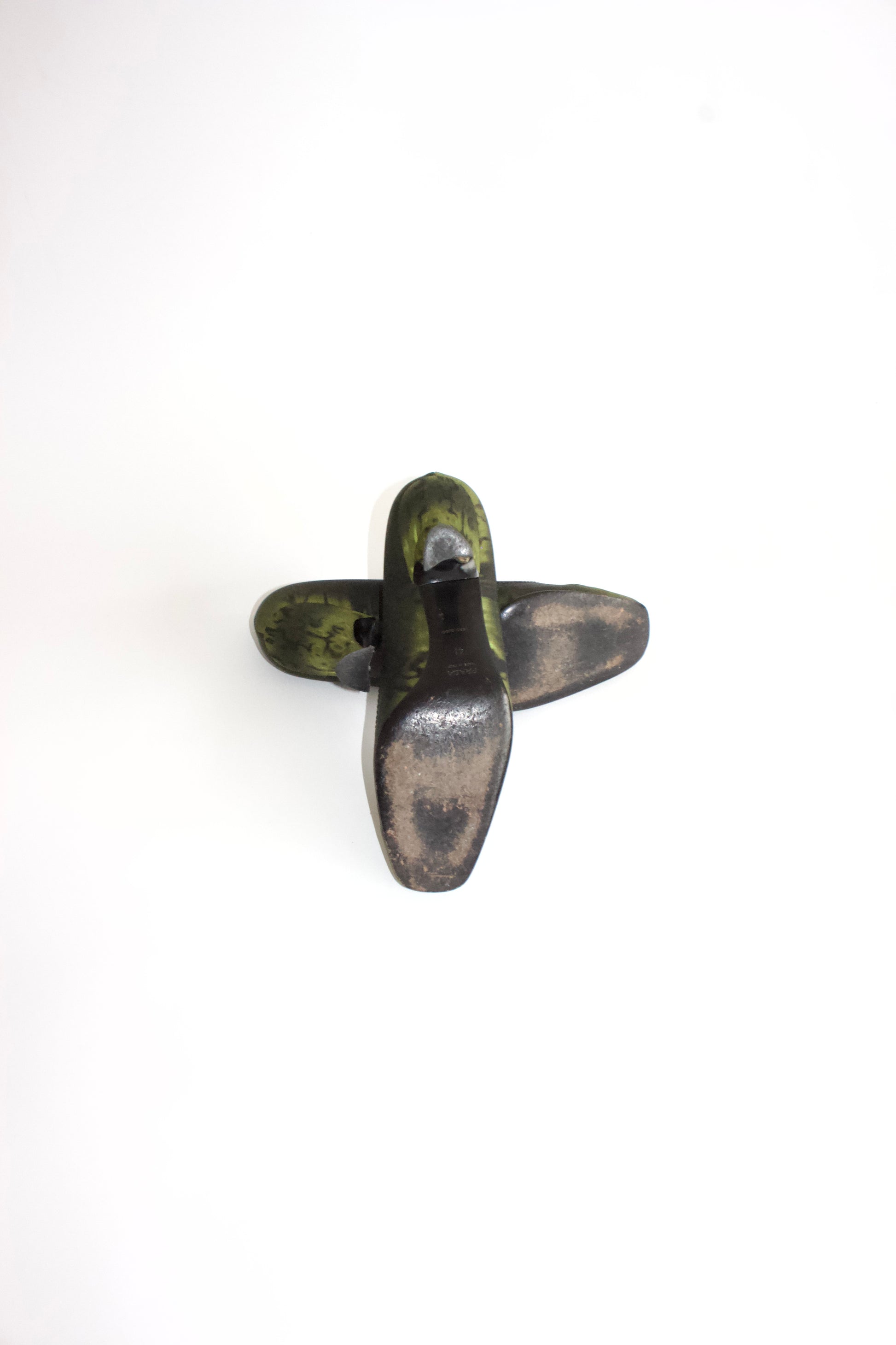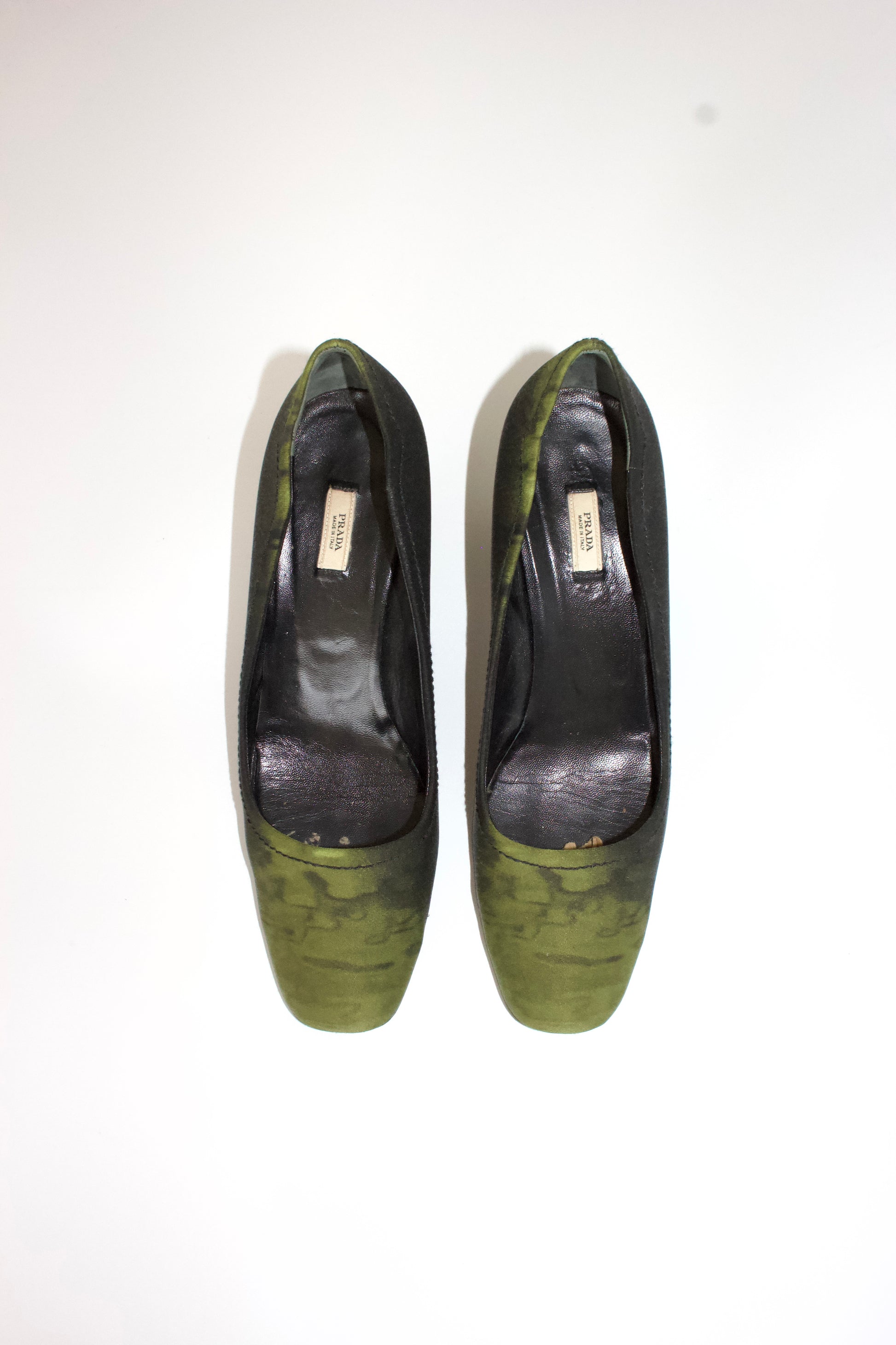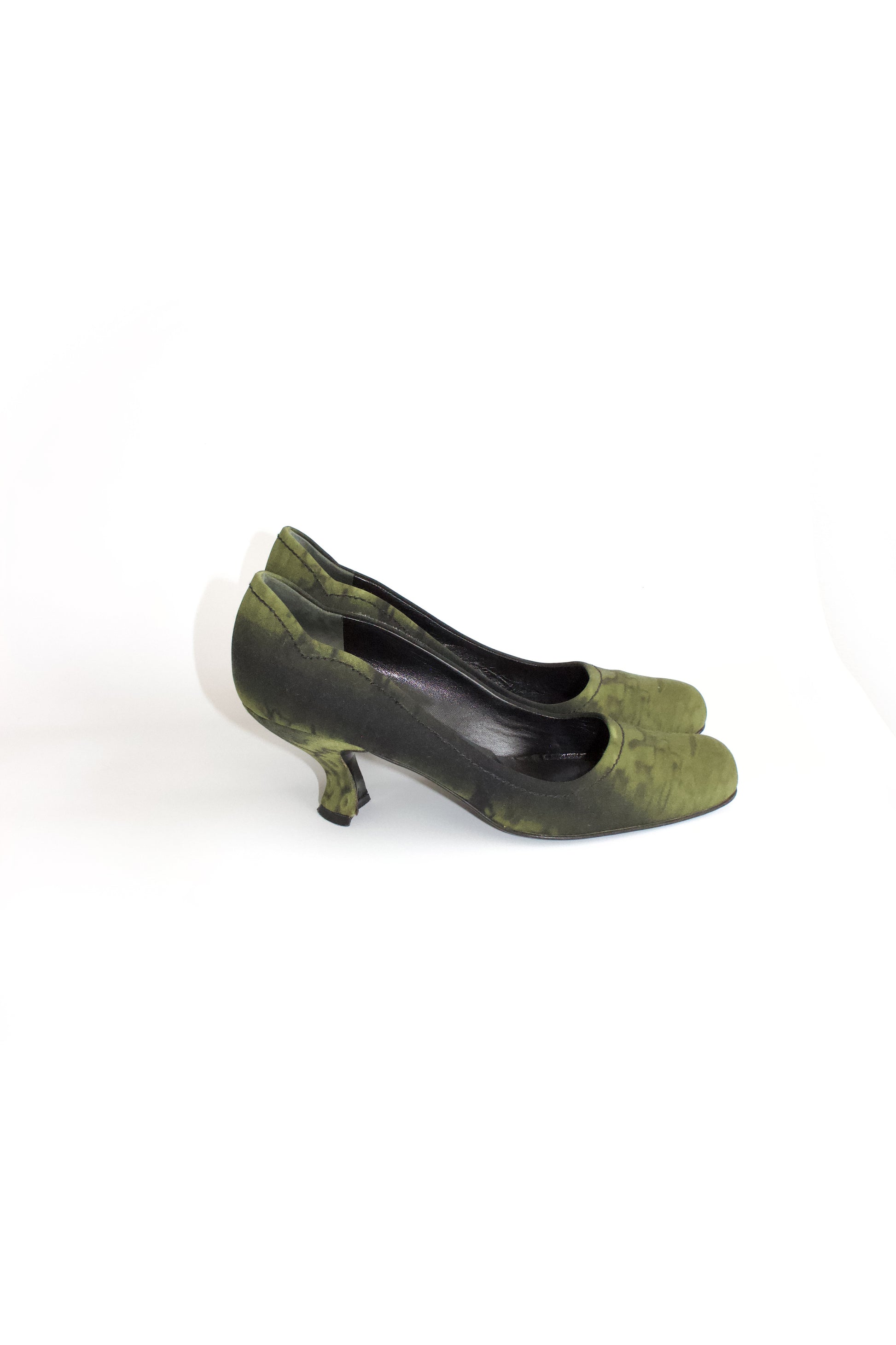 Iconic curved heel silhouette. Green satin exterior. Leather interior.