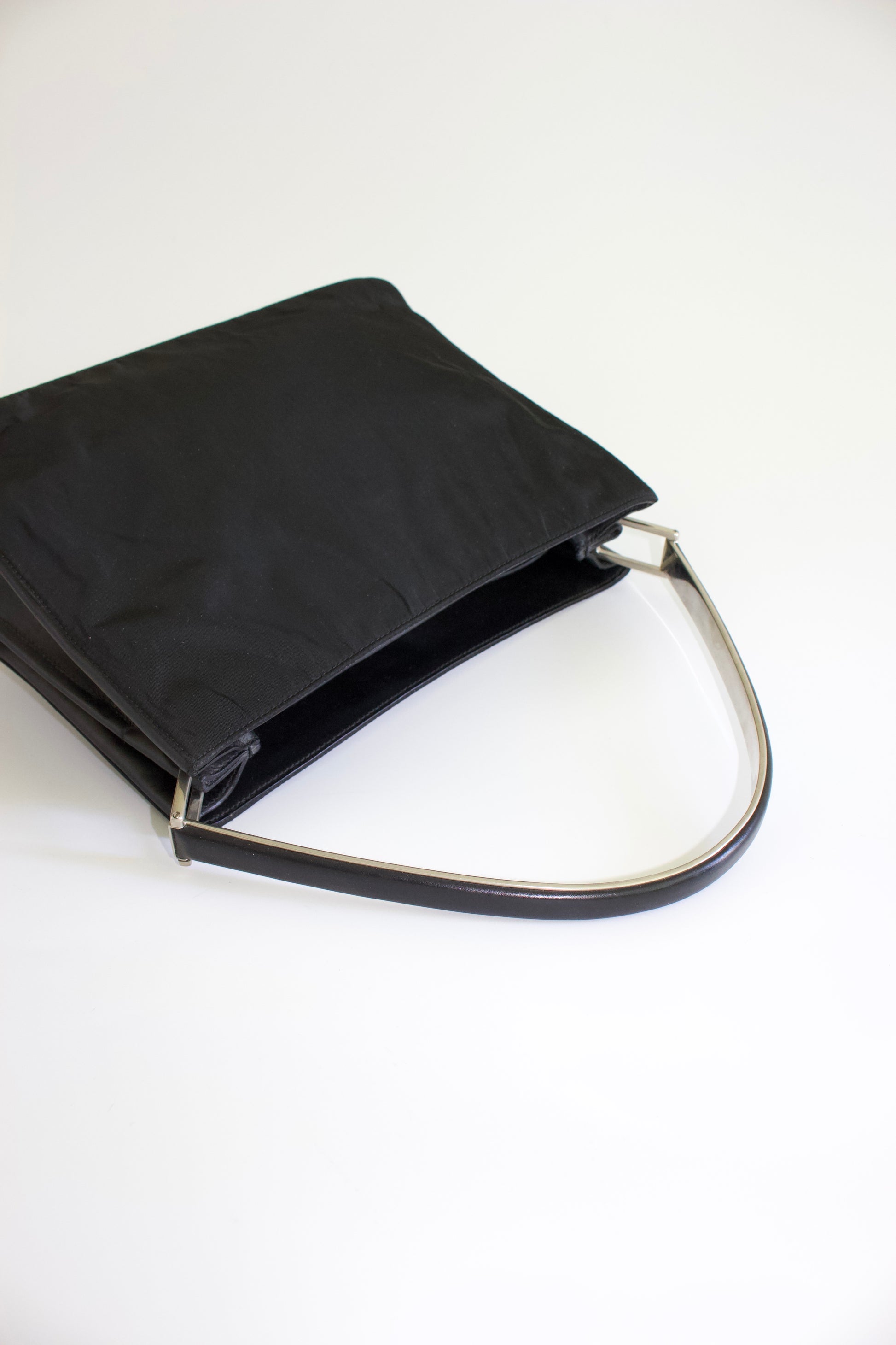 Prada FW1998 black nylon shoulder bag with metal handle, Prada Fall Winter 1998 bag, Prada vintage nylon bag, Prada archival handbag, Prada designer shoulder bag, Prada black nylon purse, Prada luxury fashion accessory, Prada metal handle bag, Prada 90s shoulder bag, Prada collectible fashion piece.