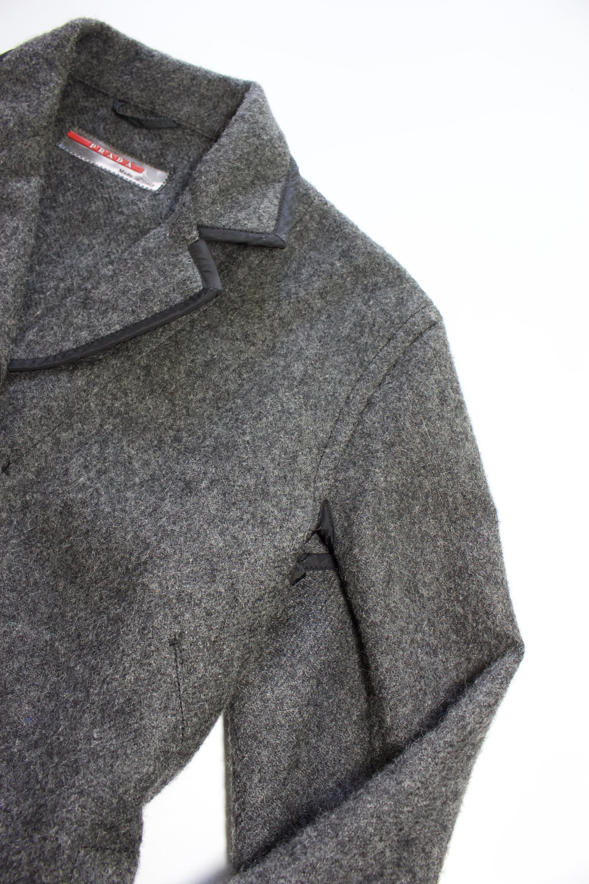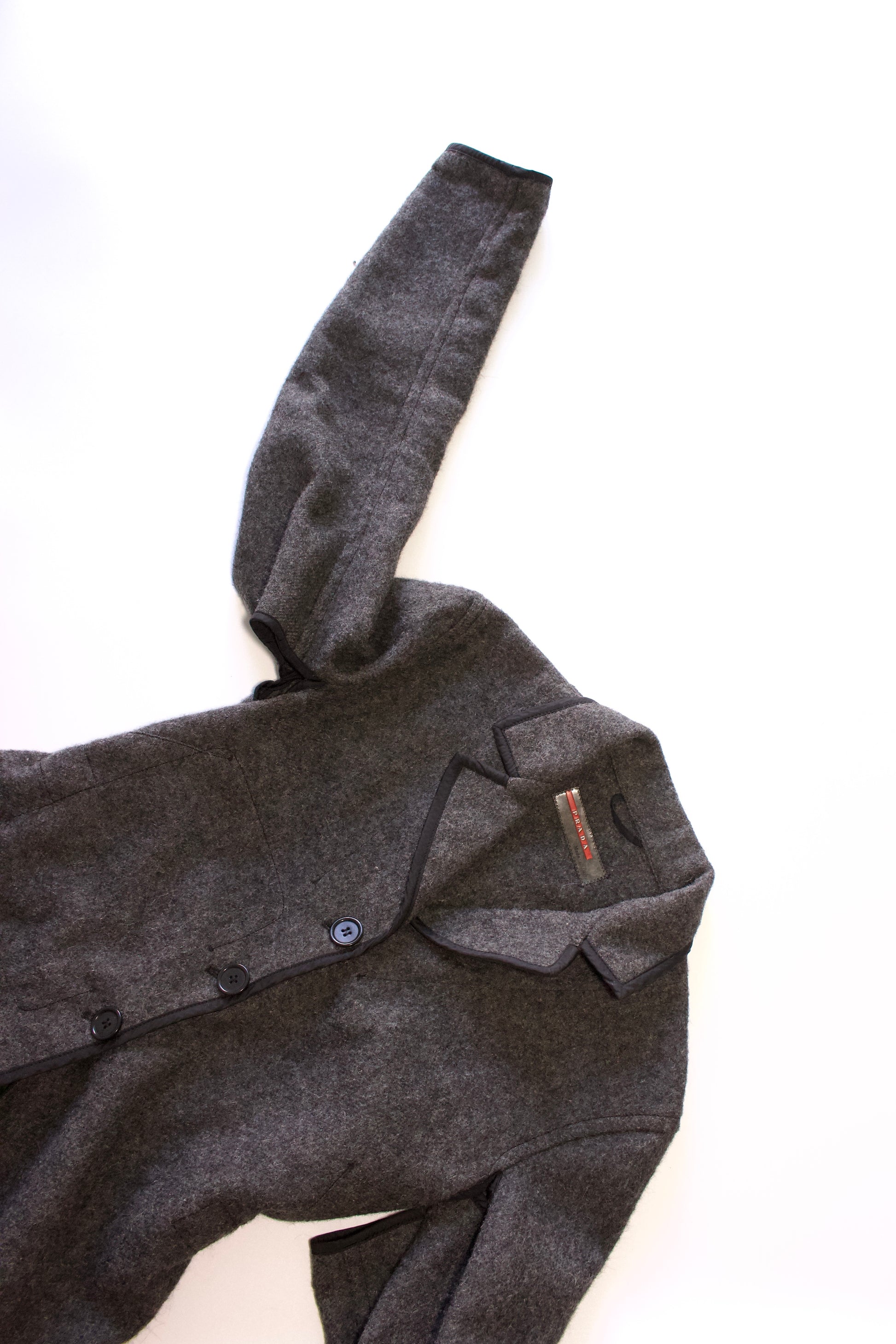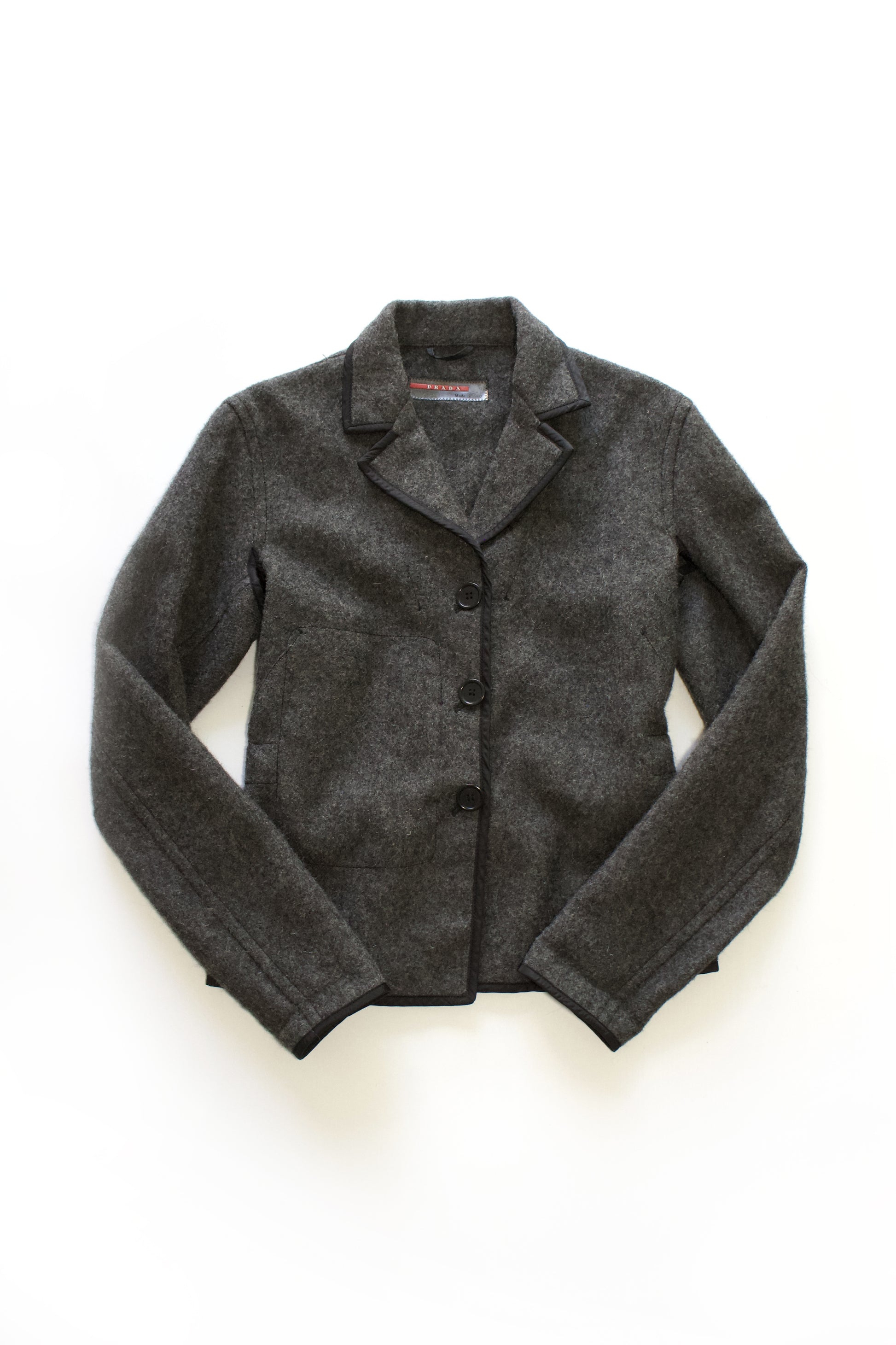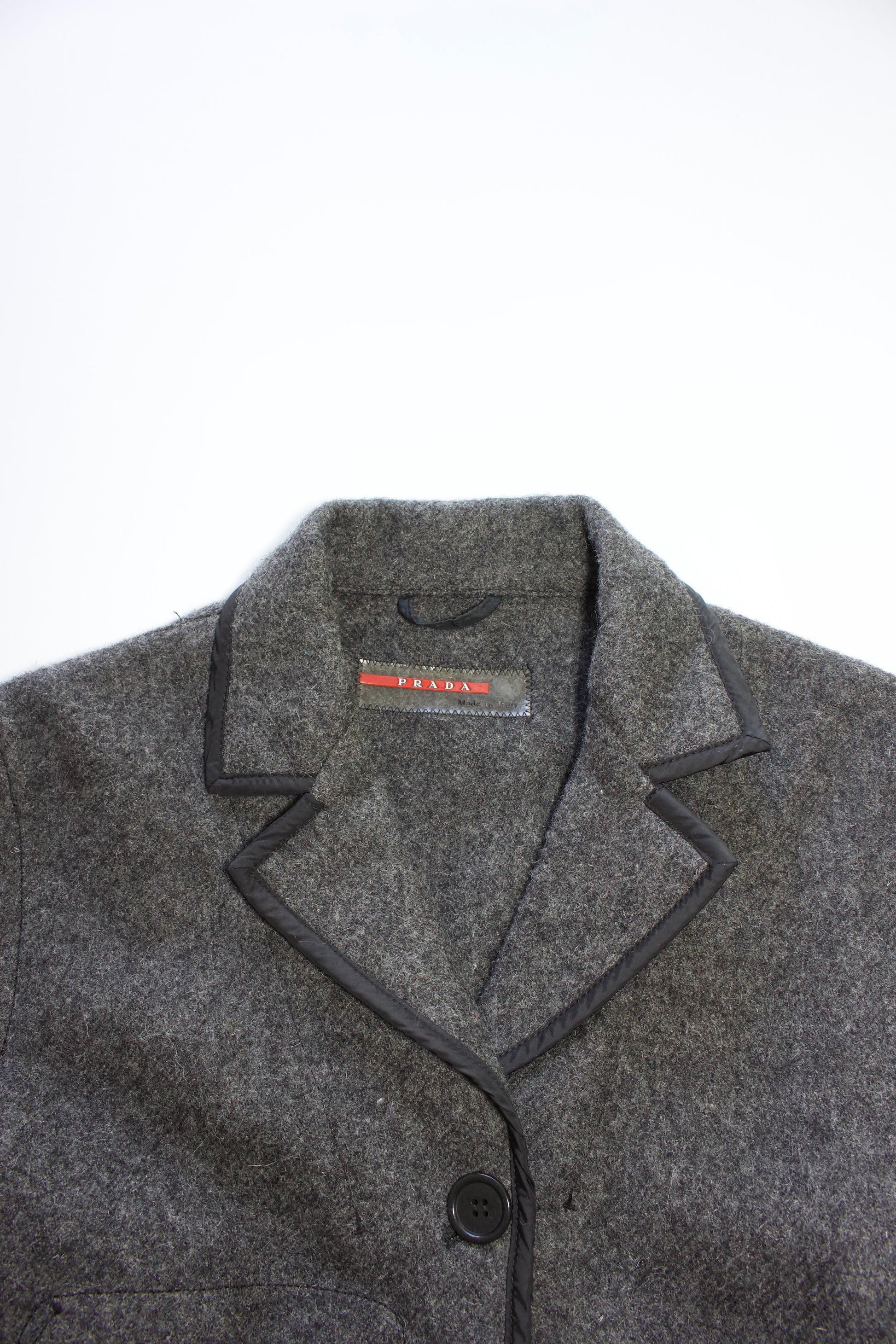 Prada grey wool jacket, Prada tailored jacket, Prada wool blazer, designer grey jacket, luxury Prada outerwear, Prada structured wool jacket, Prada classic grey blazer, Italian designer wool jacket, Prada women’s grey jacket, Prada runway jacket, timeless Prada wool outerwear, Prada business casual jacket, Prada fashion week grey blazer, Prada grey wool coat style, Prada luxury grey jacket for women.