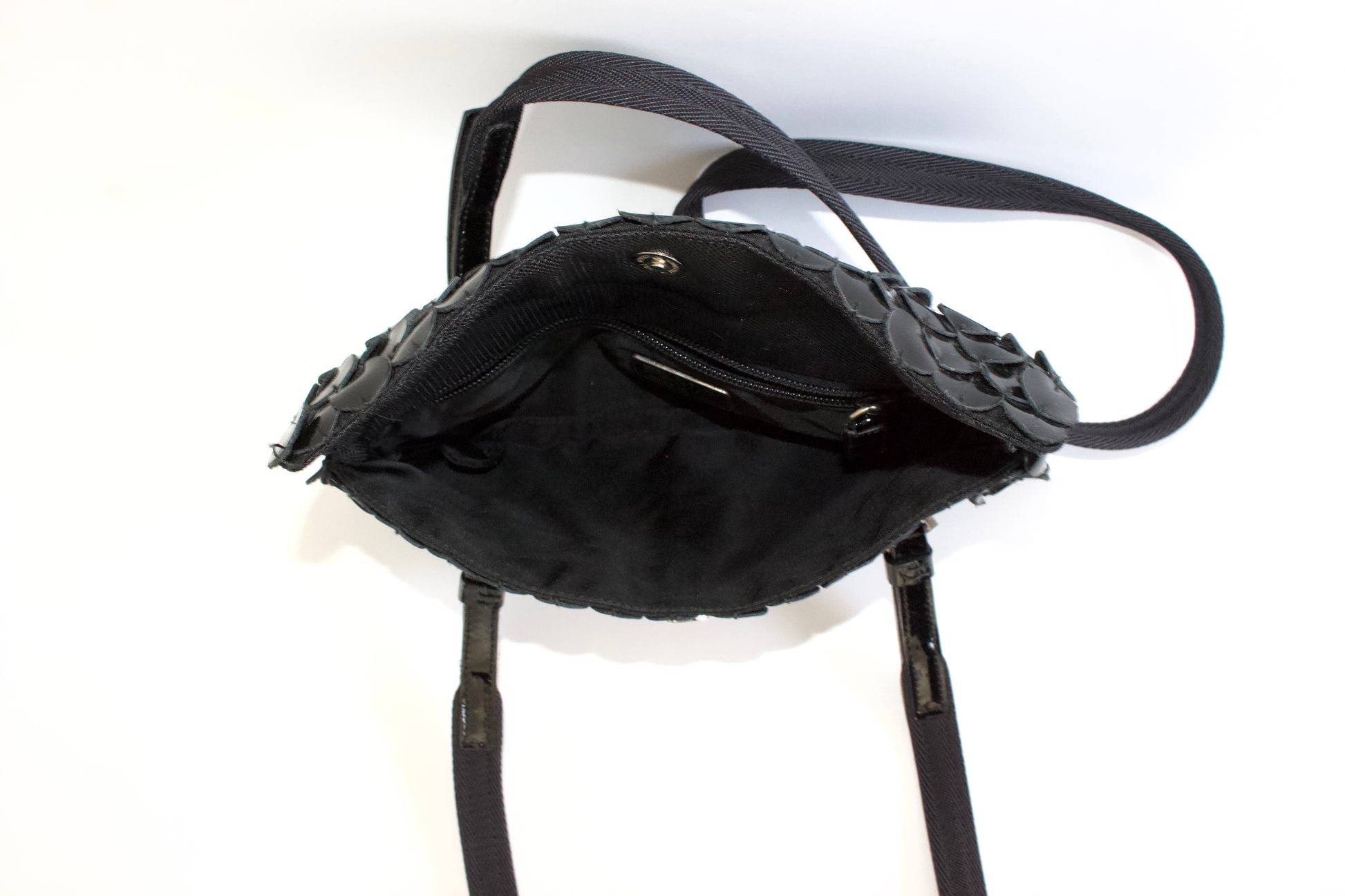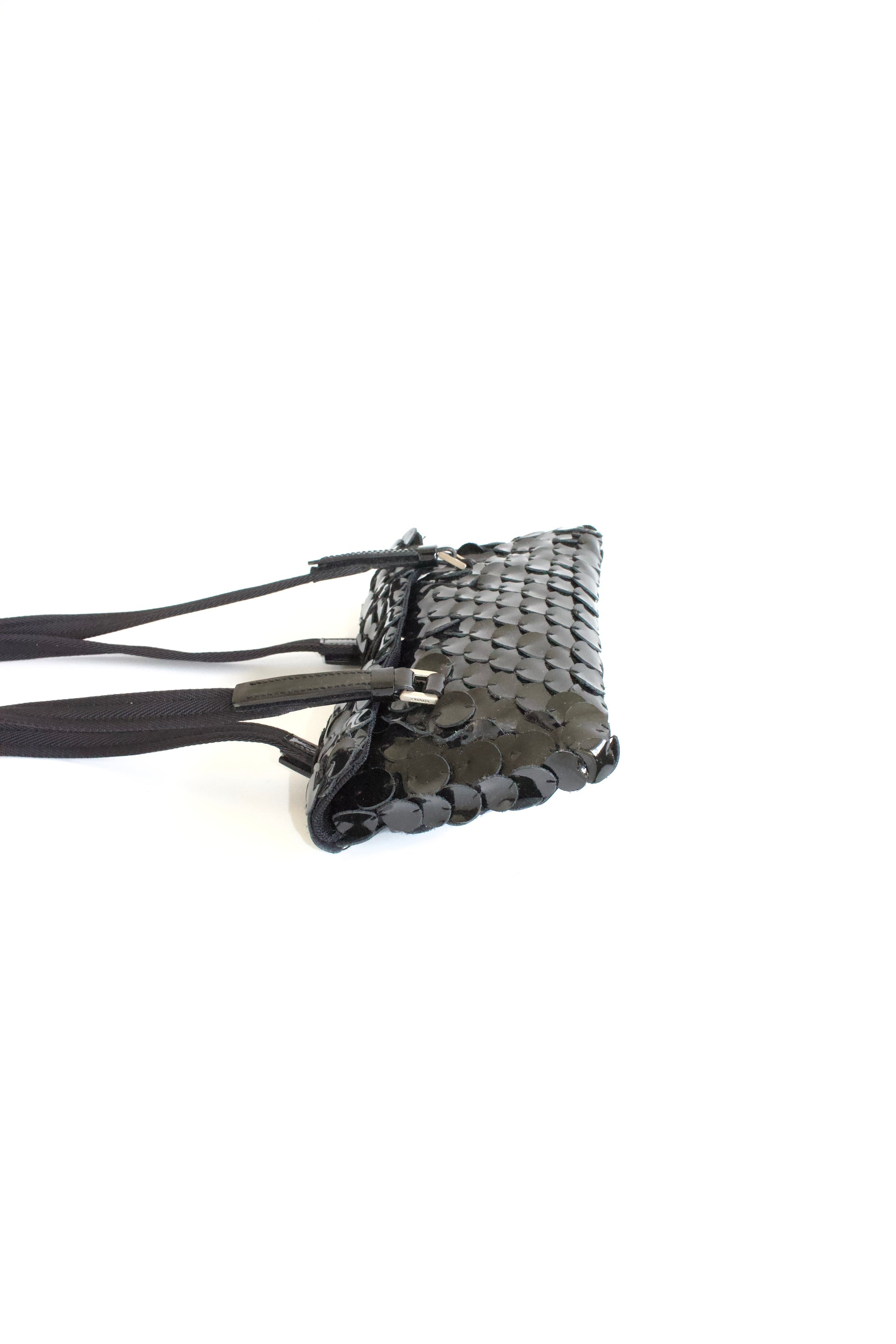 Shiny patent leather discs product a fish-scale effect. Long fabric straps to be carried by hand or on the shoulder.