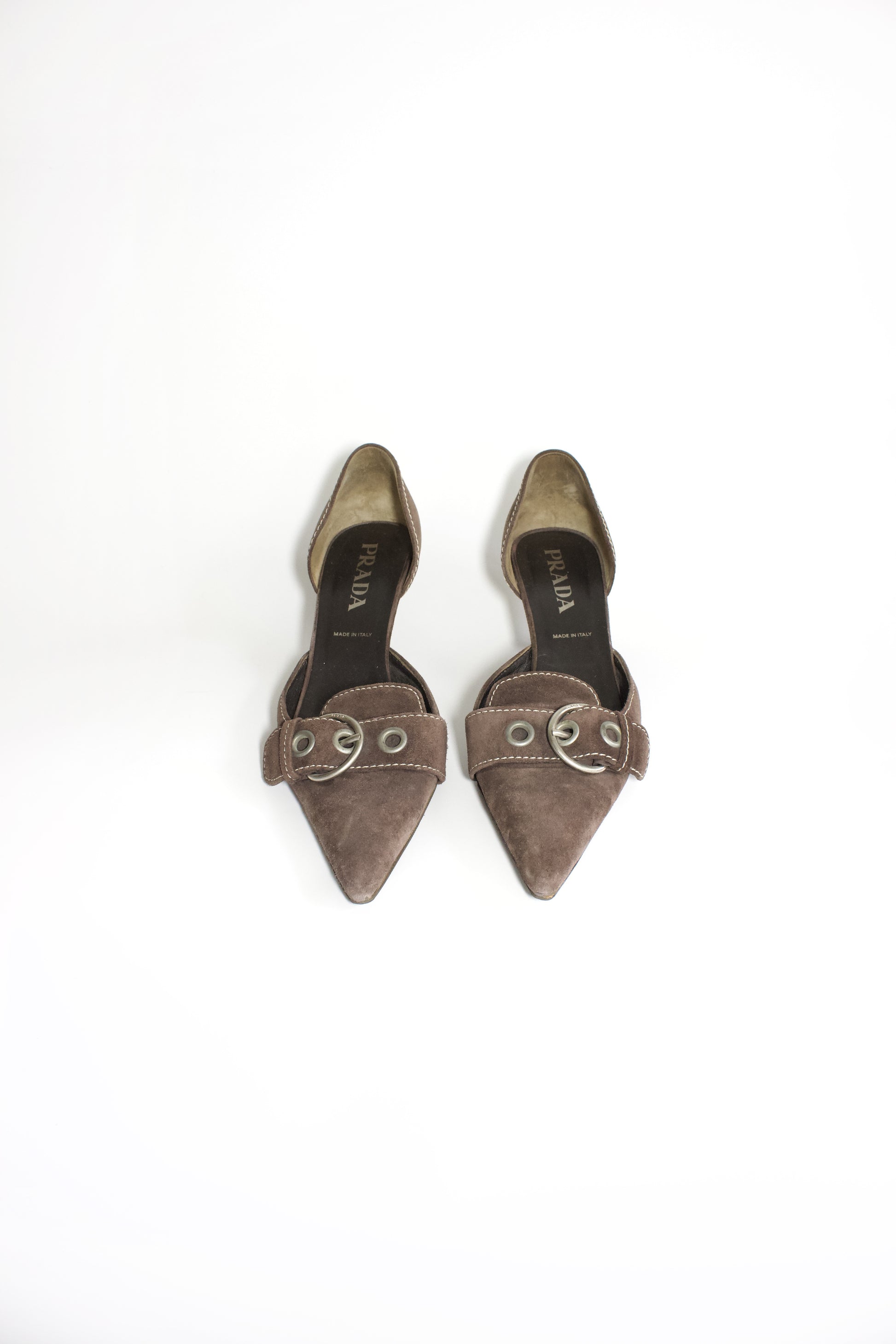 Prada SS 2002 brown suede kitten heels, Prada 2002 runway shoes, Prada brown suede pumps, Prada kitten heel sandals, Prada vintage heels, Prada archive shoes, Prada collectible footwear, Prada suede designer heels, Prada early 2000s shoes, Prada luxury kitten heels, Prada Italian suede heels, Prada SS02 brown shoes, Prada authentic suede pumps, Prada rare kitten heels, Prada pre-loved vintage heels.