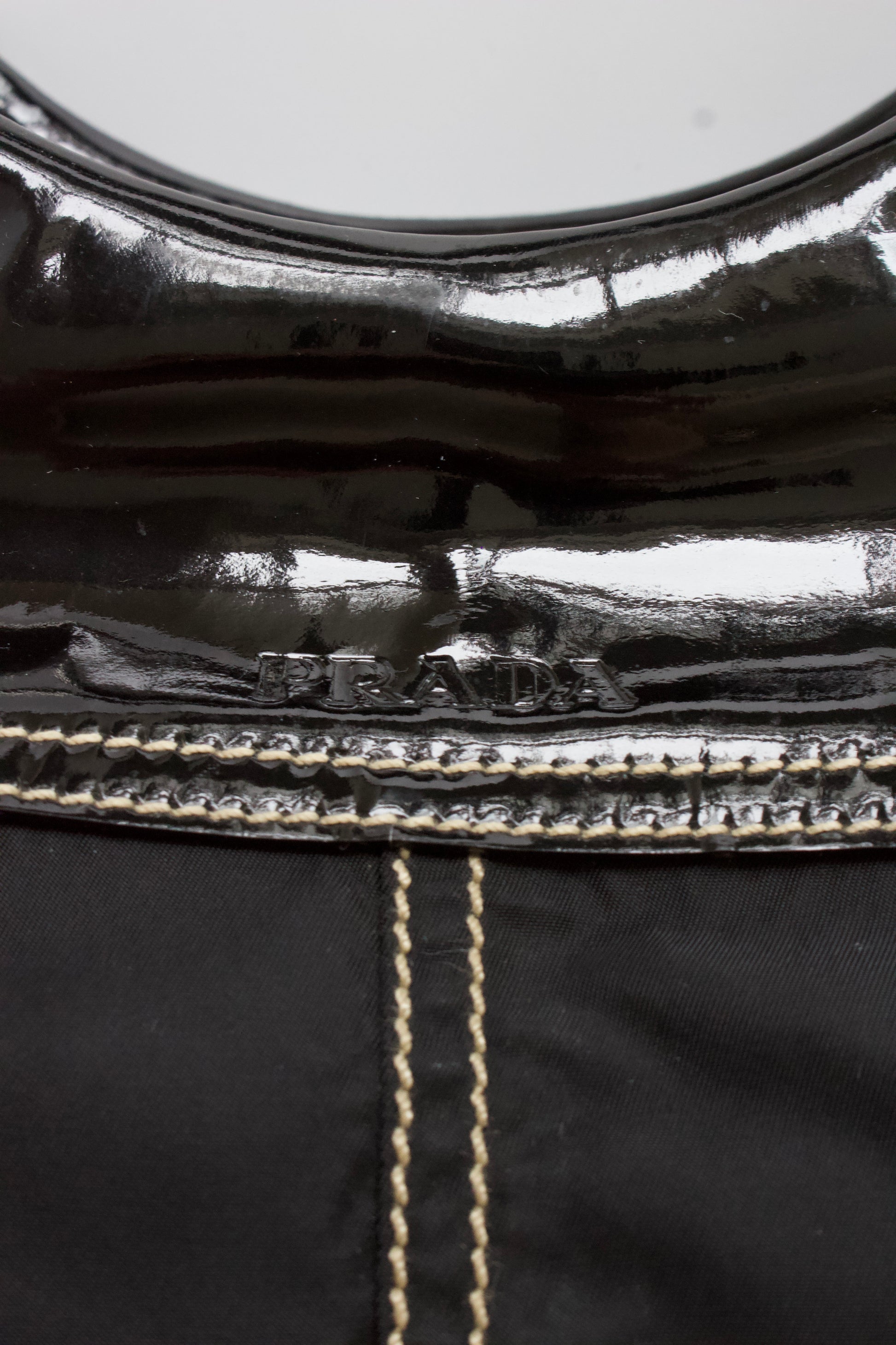 Black nylon with contrast stitching. Iconic metal handles. Patent leather inserts at the top and bottom.