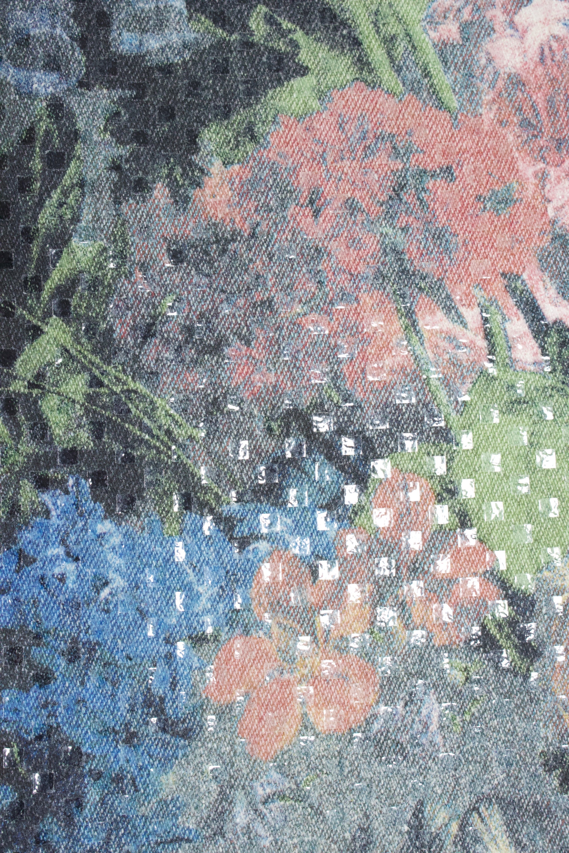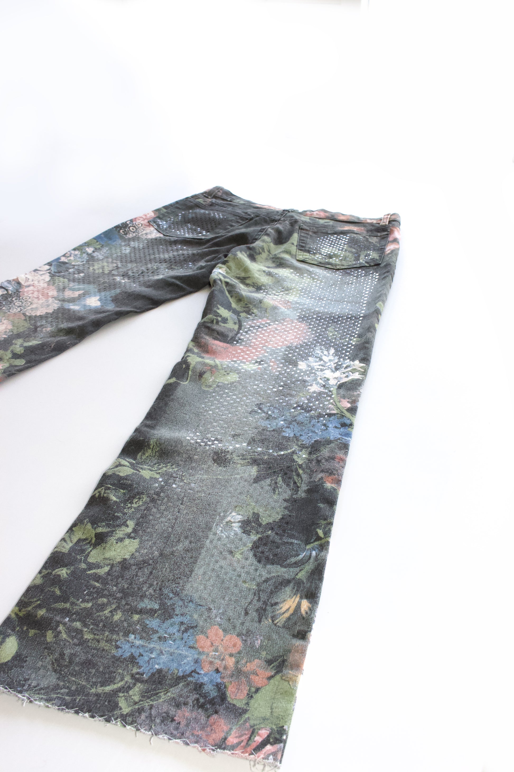 Baroque floral motif. Plastic squares that line the front and the back of the pant legs, that shine beautifully in direct lighting.