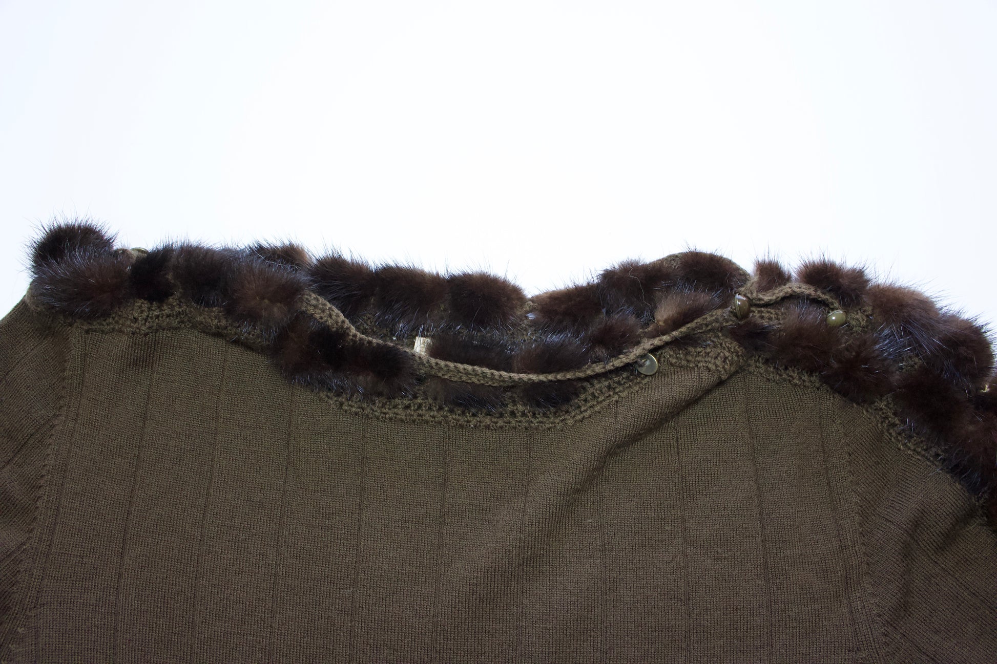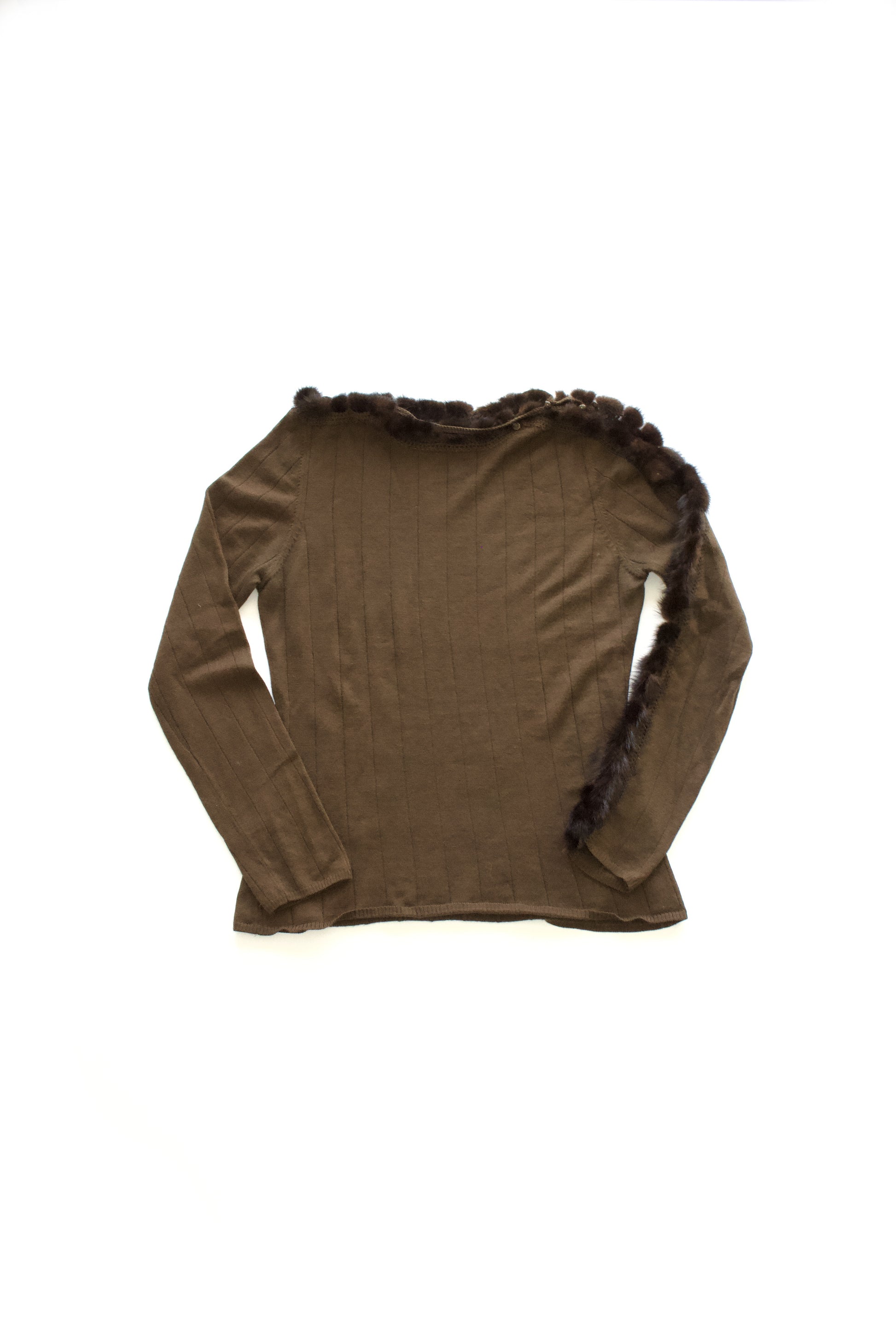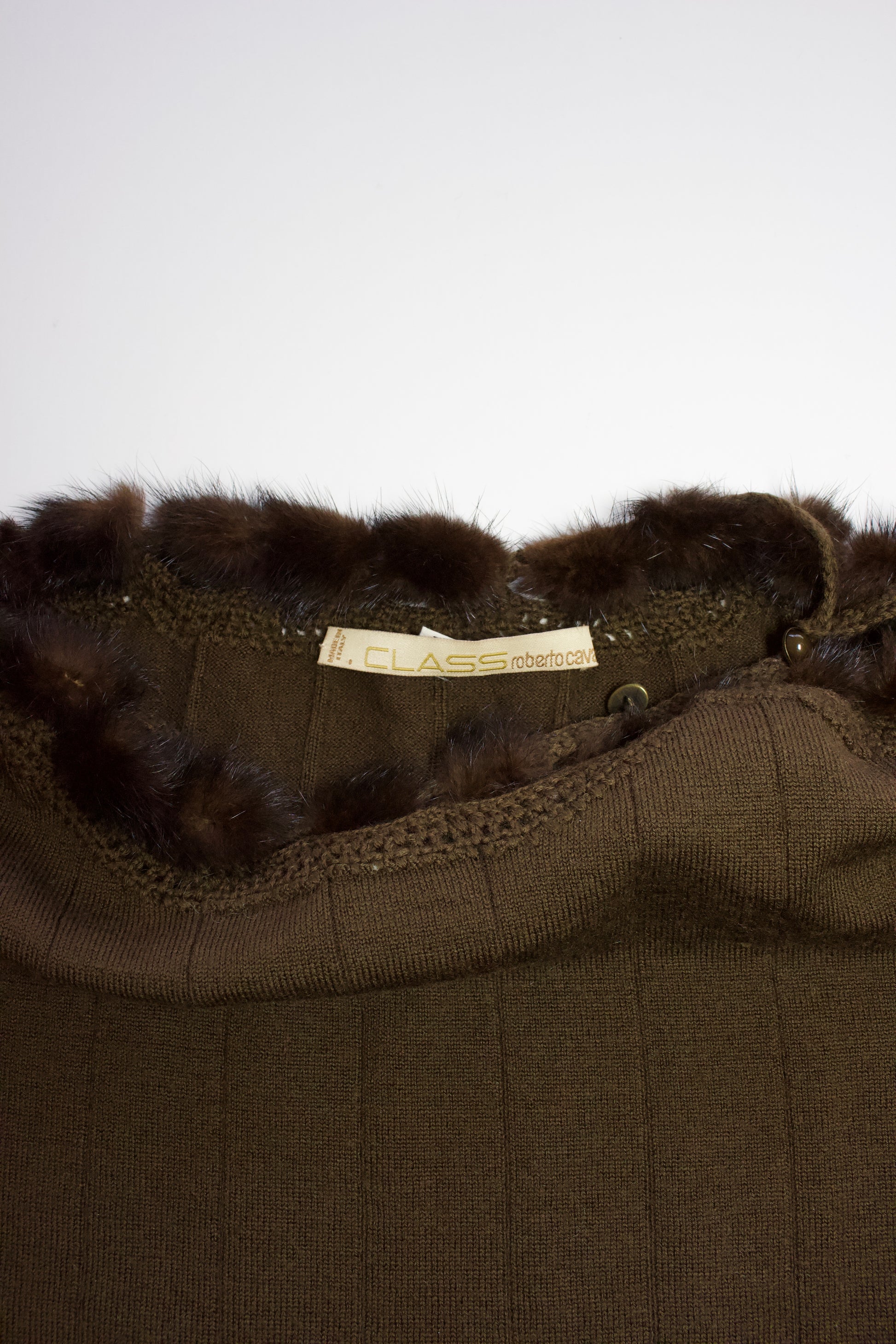 Roberto Cavalli brown top with fur sleeve, Roberto Cavalli designer blouse, Roberto Cavalli statement top, Roberto Cavalli luxury fashion, Roberto Cavalli fur-trimmed top, Roberto Cavalli archival clothing, Roberto Cavalli vintage-inspired blouse, Roberto Cavalli brown long-sleeve top, Roberto Cavalli runway fashion, Roberto Cavalli collectible piece