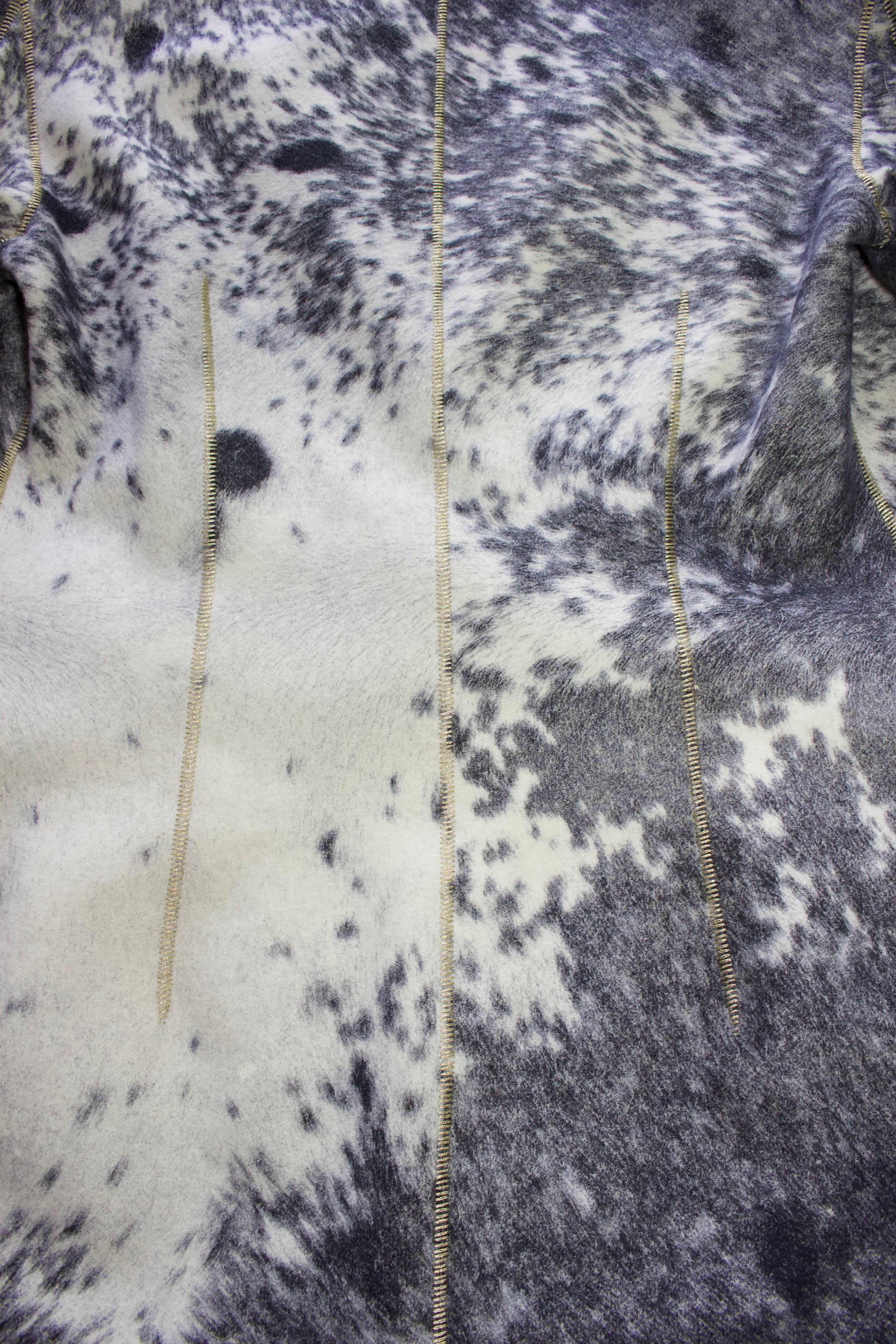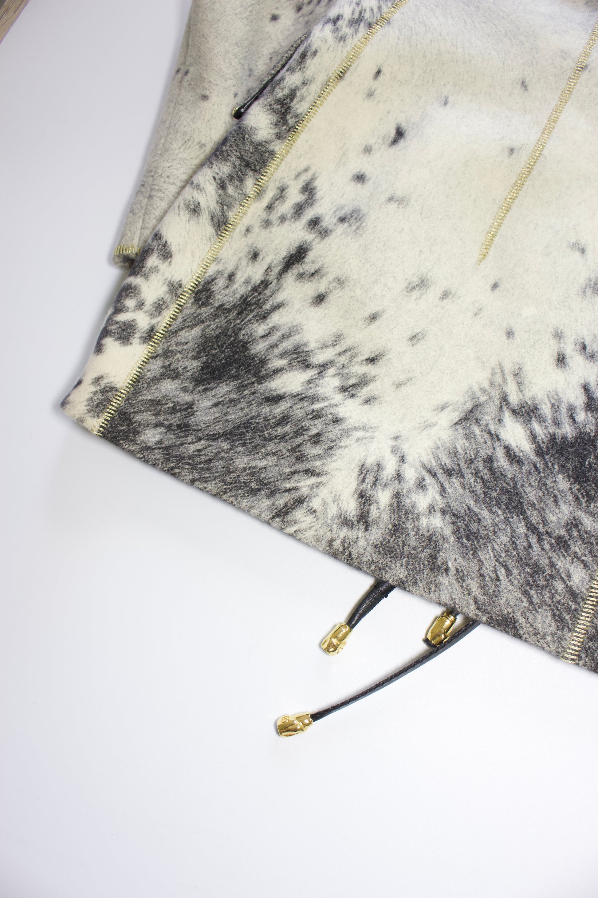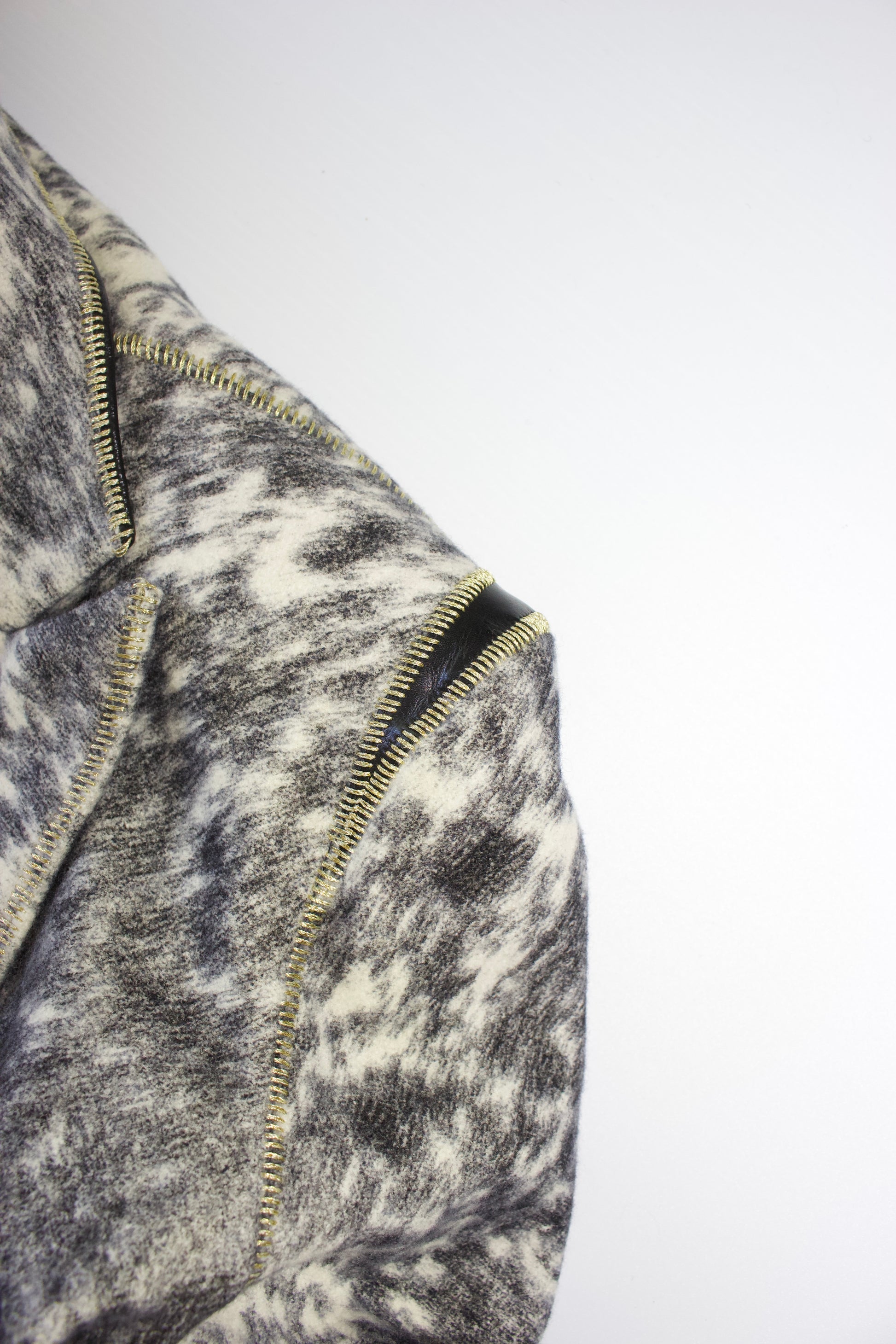 Animal print wool with leather inserts.