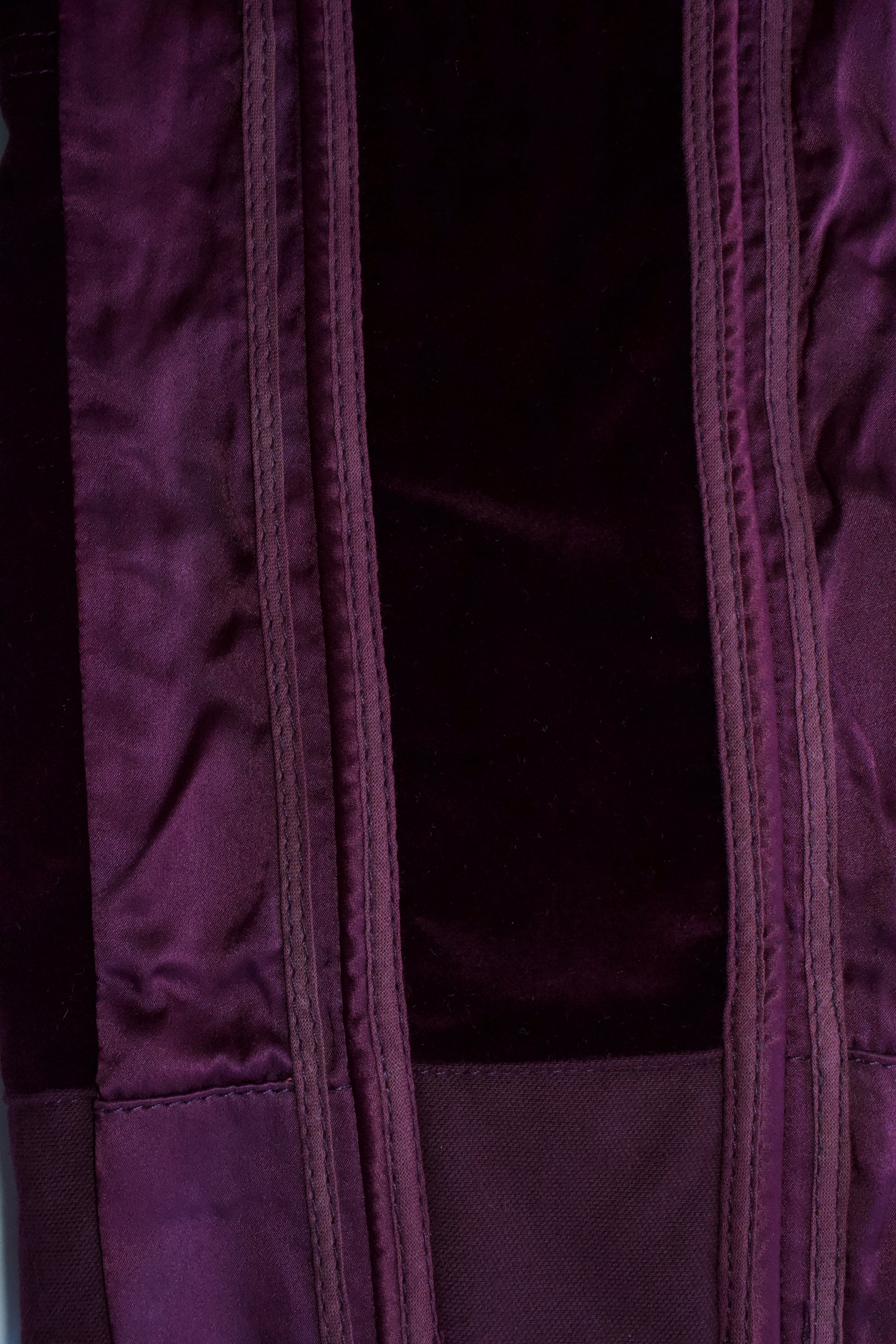 Soft velvet with smooth silk insets and piping. Tight pant legs. Zippers at the bottom of the pant leg.